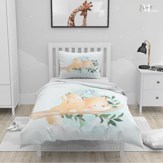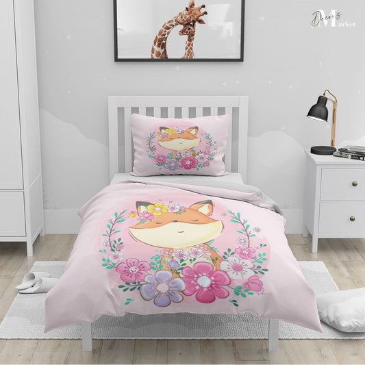 Flower Baby Fox Duvet Cover Set w Pillow Cover, Pink Art Watercolor 3D Quilt Cover, Single Double Queen King Size Doona Cover