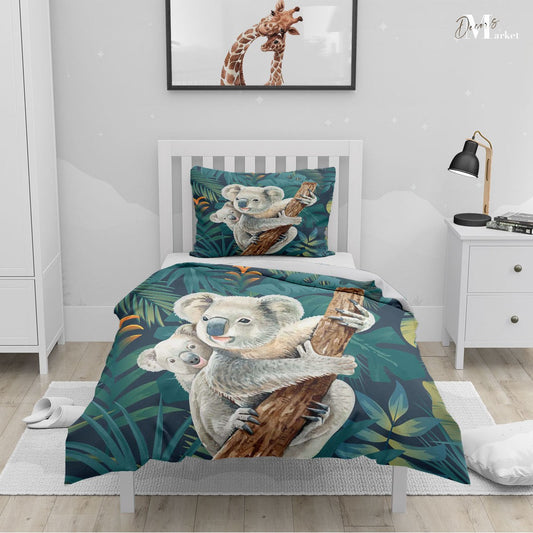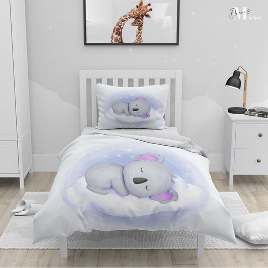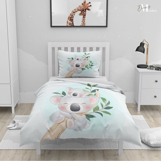 Napping Baby Koala Duvet Cover Set w Pillow Cover, Gray Art Watercolor 3D Quilt Cover, Single Double Queen King Size Doona Cover