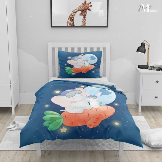 Elephant Carrot Plane Duvet Cover Set w Pillow Cover, Blue Art Watercolor 3D Quilt Cover, Single Double Queen King Size Doona Cover