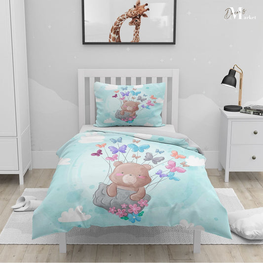 Flying Teddy Bear Duvet Cover Set w Pillow Cover, Blue Art Watercolor 3D Quilt Cover, Single Double Queen King Size Doona Cover