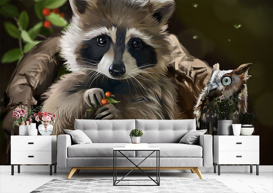 Racoon Owl Animals Wild Animals Brown Wallpaper Mural,Self-Adhesive Peel And Stick 3D Wall Paper,Australian Company Designer Wall Decor