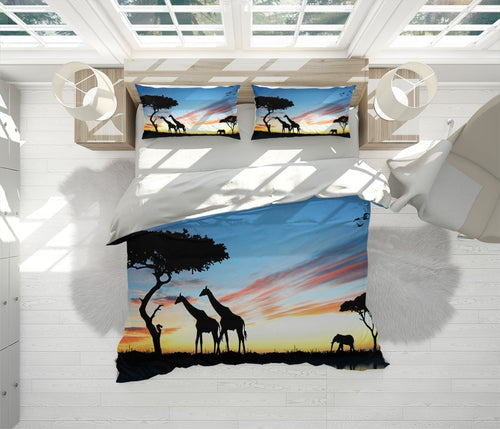 Giraffes Africa Duvet Cover Set W Pillow Cover, Blue Animals Wild Animals 3D Quilt Cover, Single Double Queen King Size Doona Cover