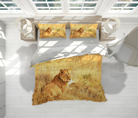 Lioness In Grass Duvet Cover Set W Pillow Cover, Orange Animals Wild Animals 3D Quilt Cover, Single Double Queen King Size Doona Cover