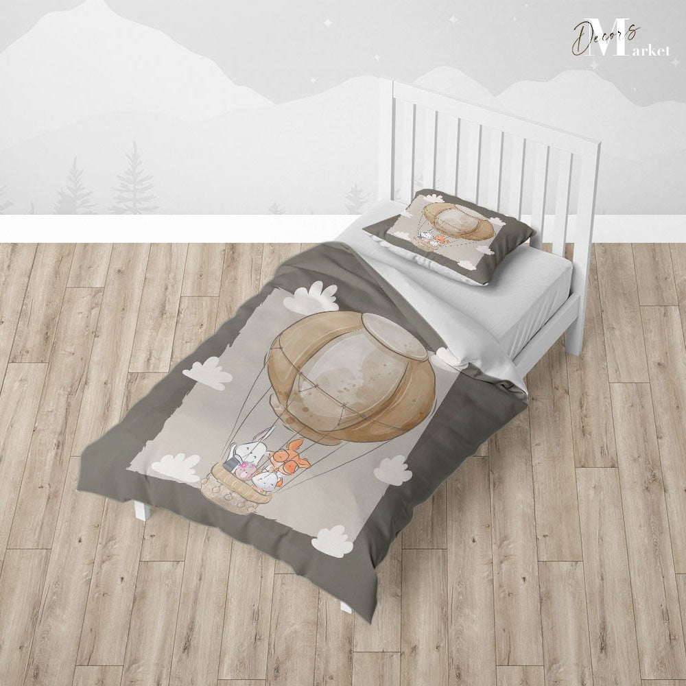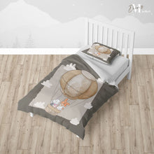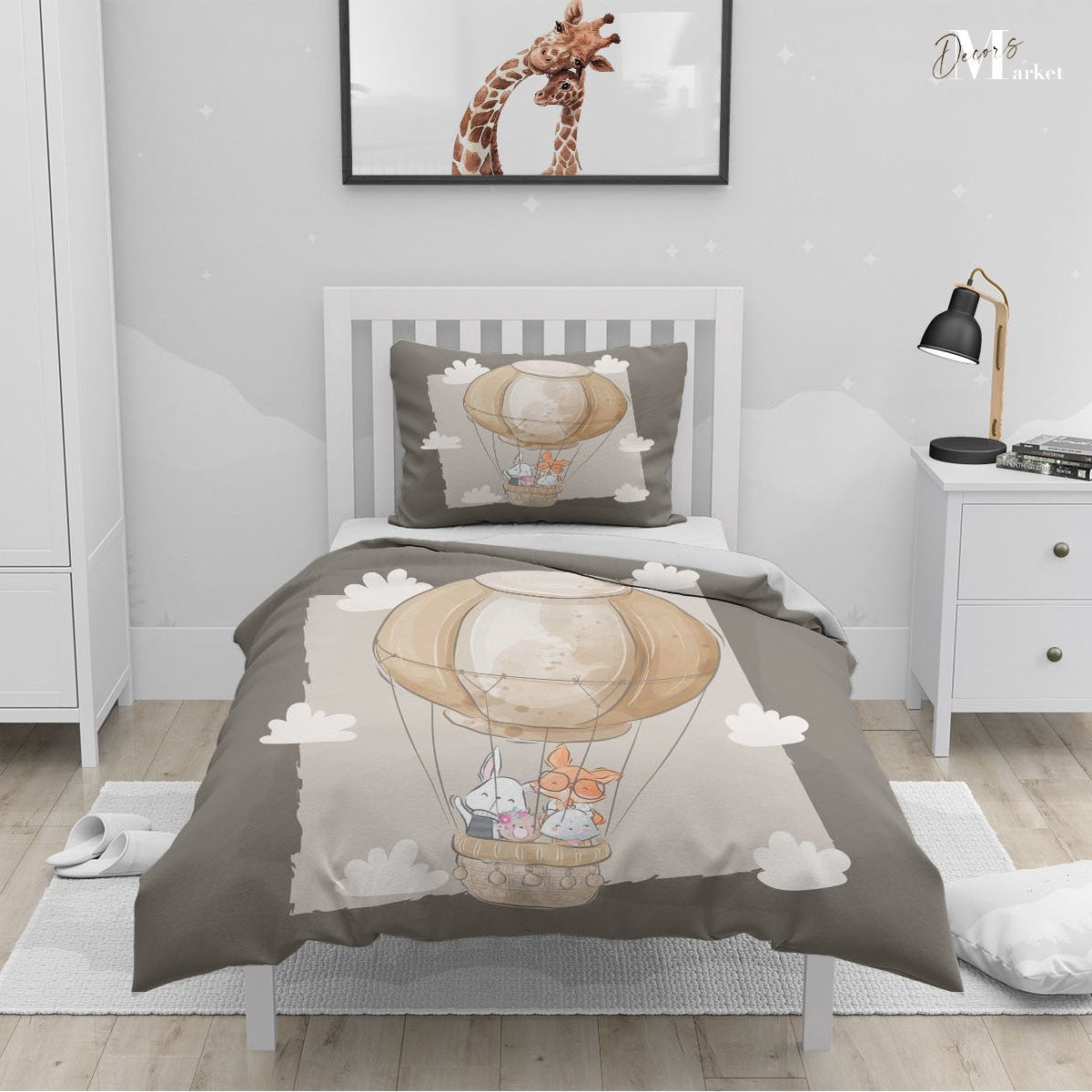 Air Balloon Fox Duvet Cover Set w Pillow Cover, Brown Kids Animal 3D Quilt Cover, Single Double Queen King Size Doona Cover