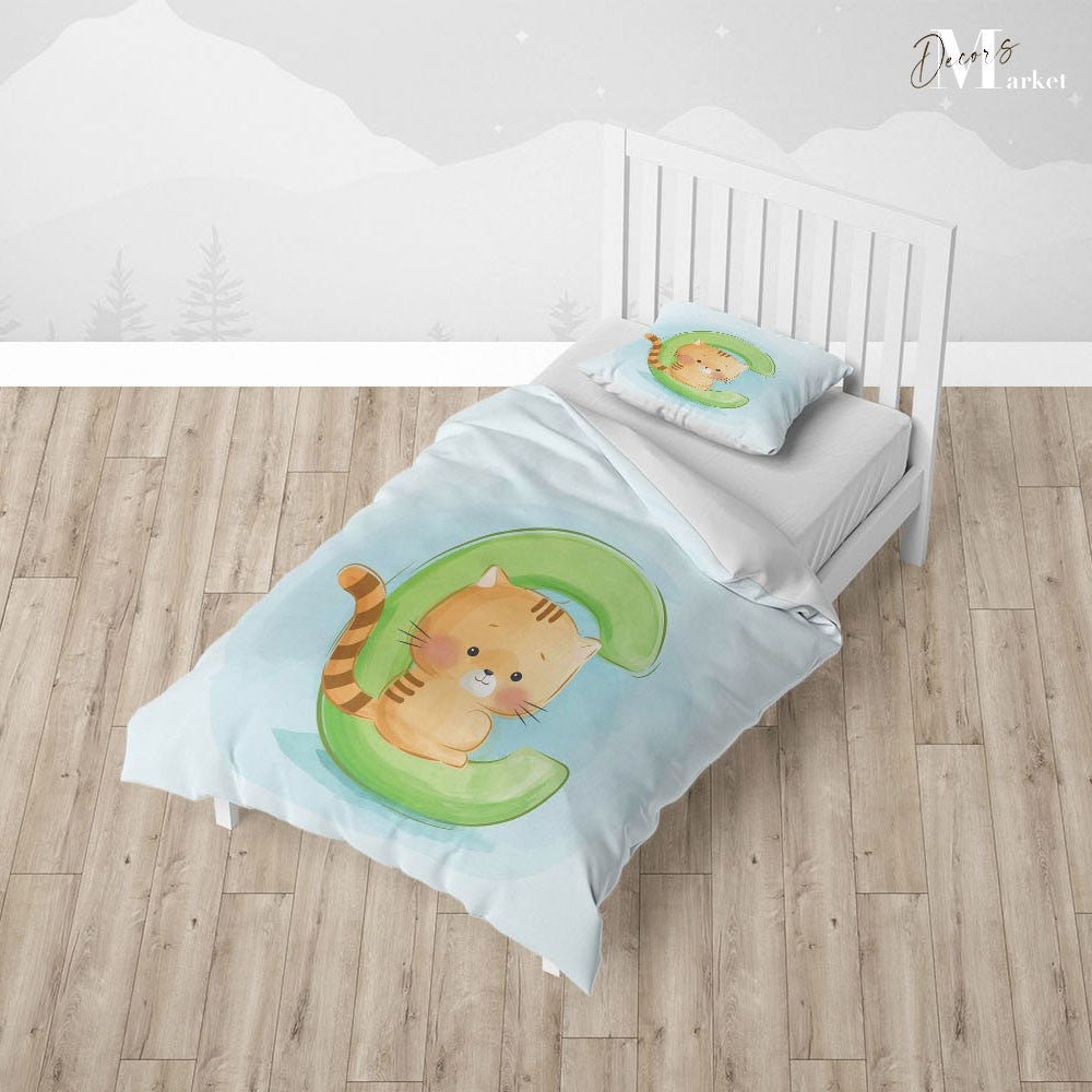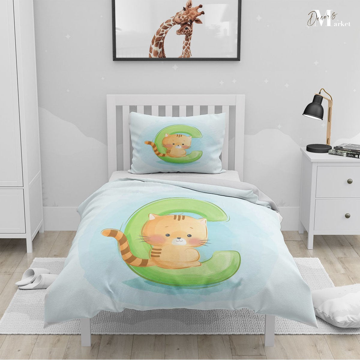Alphabet Animal C Duvet Cover Set w Pillow Cover, Blue Kids Colorful 3D Quilt Cover, Single Double Queen King Size Doona Cover