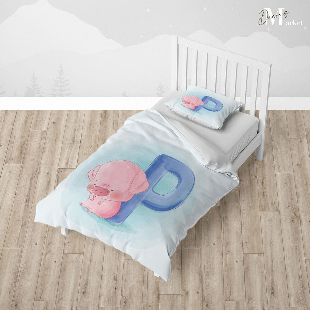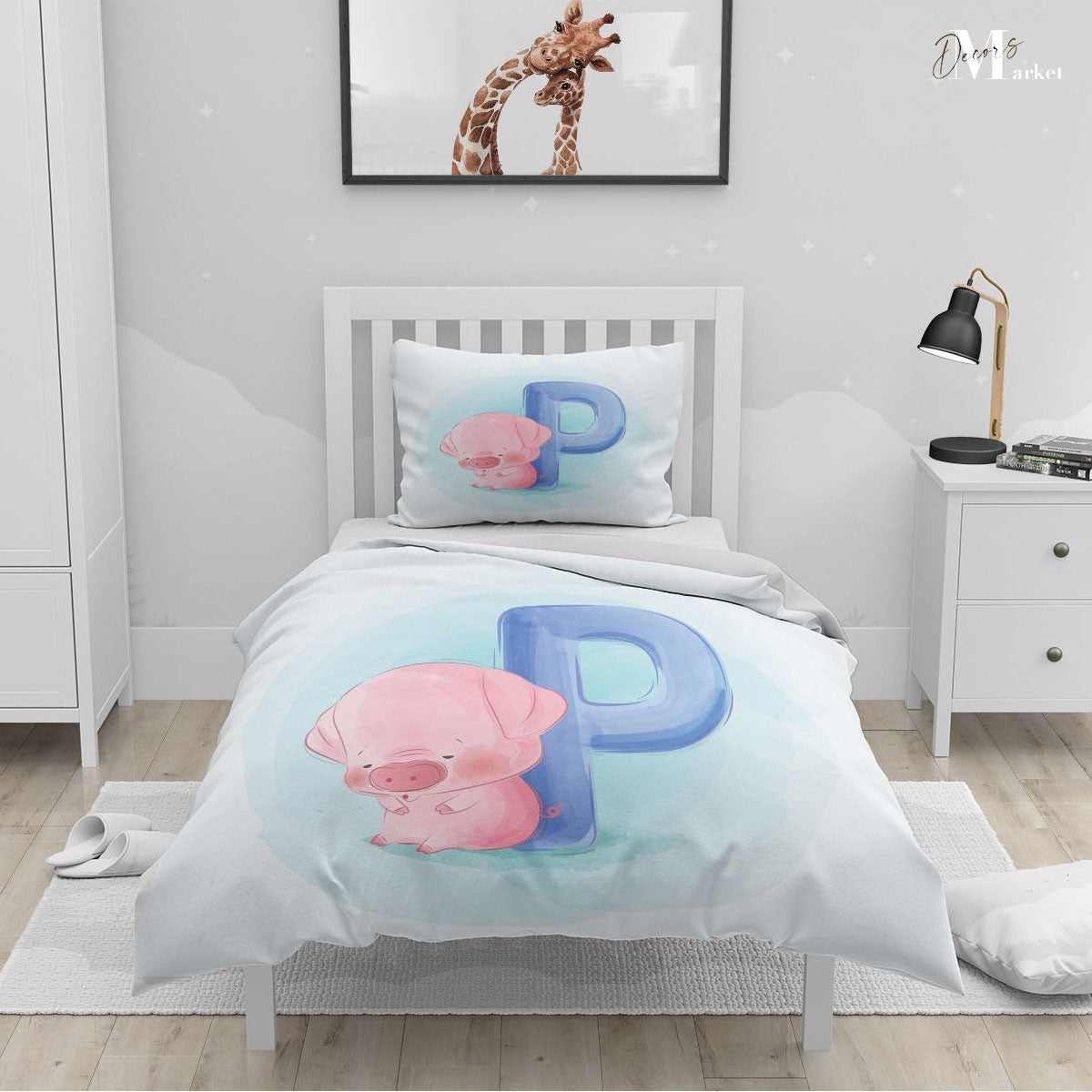 Alphabet Animal P Duvet Cover Set w Pillow Cover, Blue Kids Colorful 3D Quilt Cover, Single Double Queen King Size Doona Cover