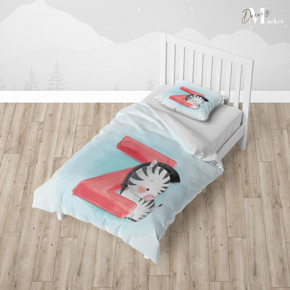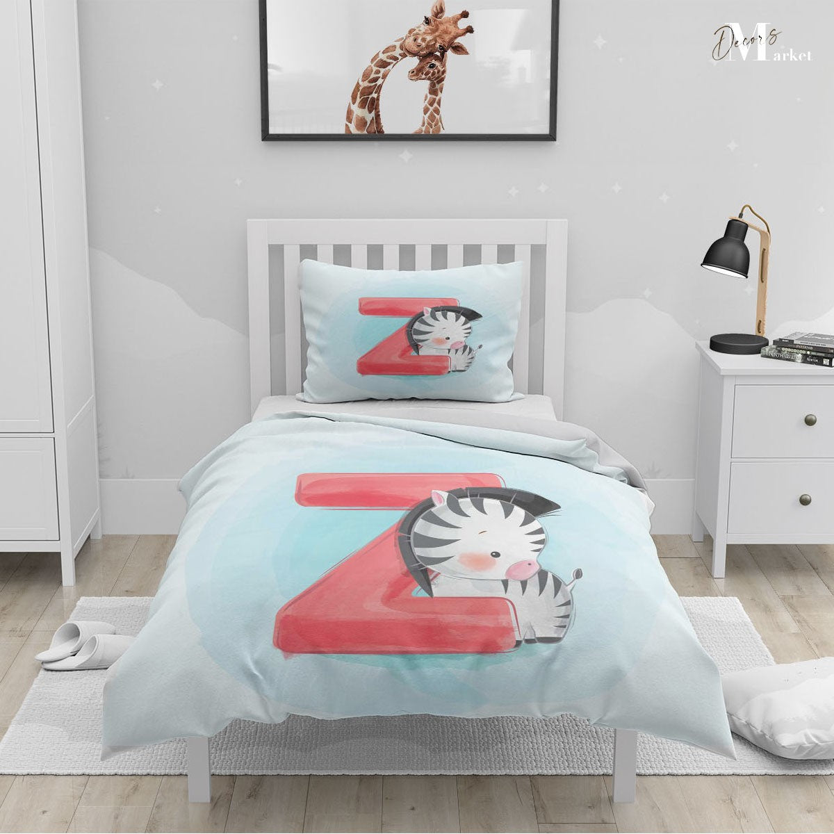 Alphabet Animal Z Duvet Cover Set w Pillow Cover, Blue Kids Colorful 3D Quilt Cover, Single Double Queen King Size Doona Cover