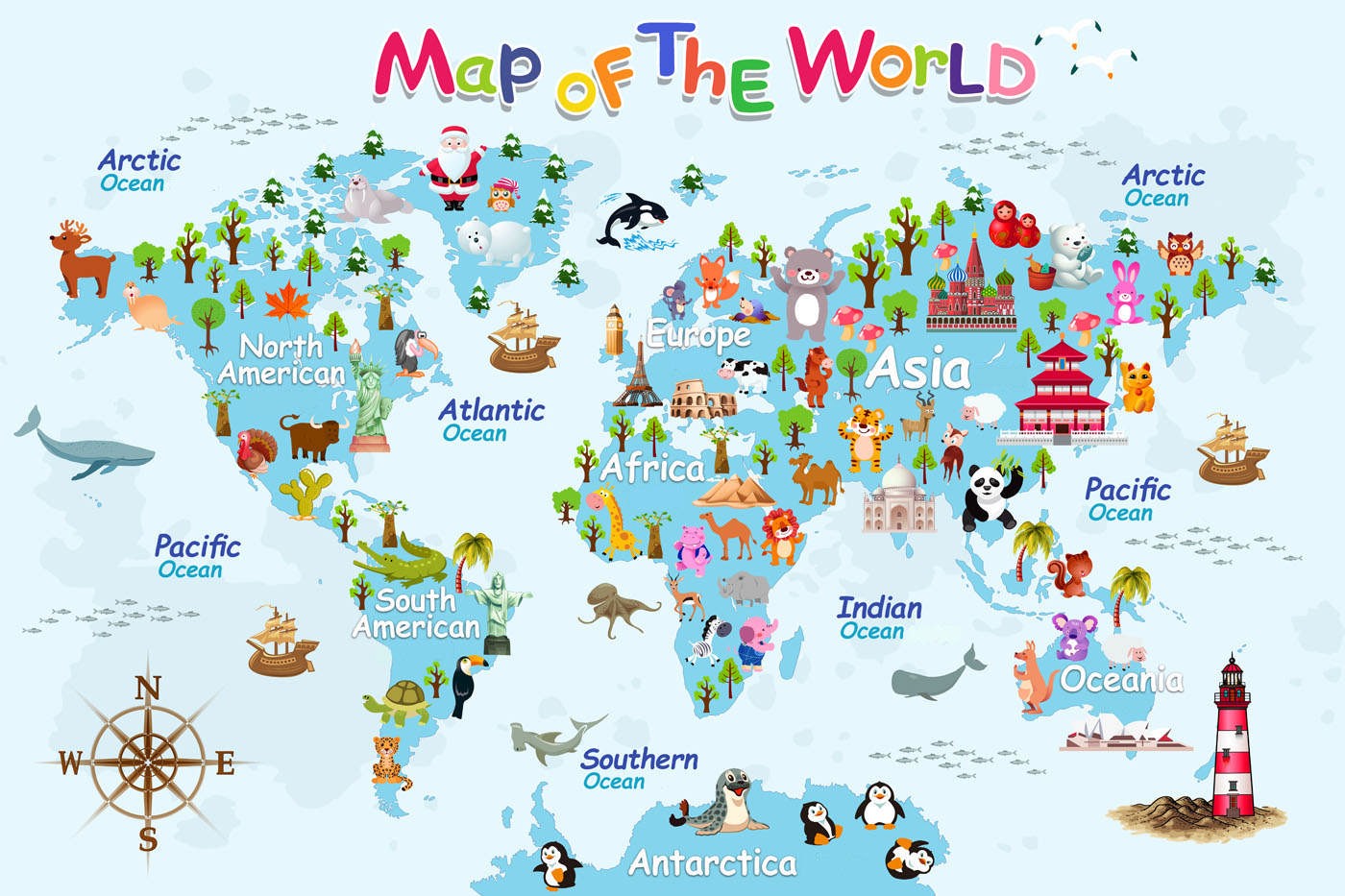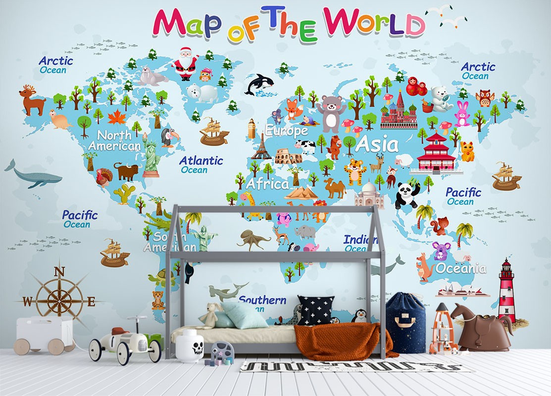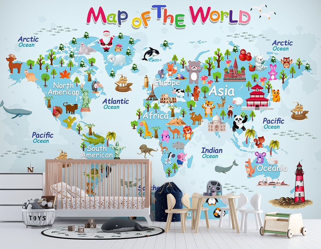 Animal Landmark Kids Kids Map Blue Wallpaper Mural,Self-Adhesive Peel And Stick 3D Wall Decor,Removable Designer Wall Decor