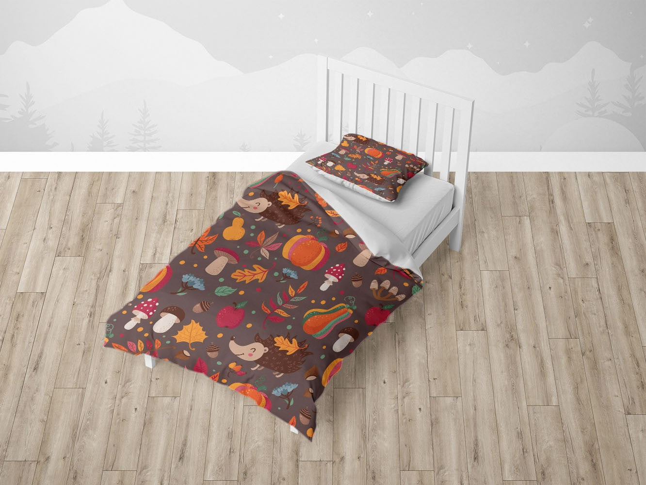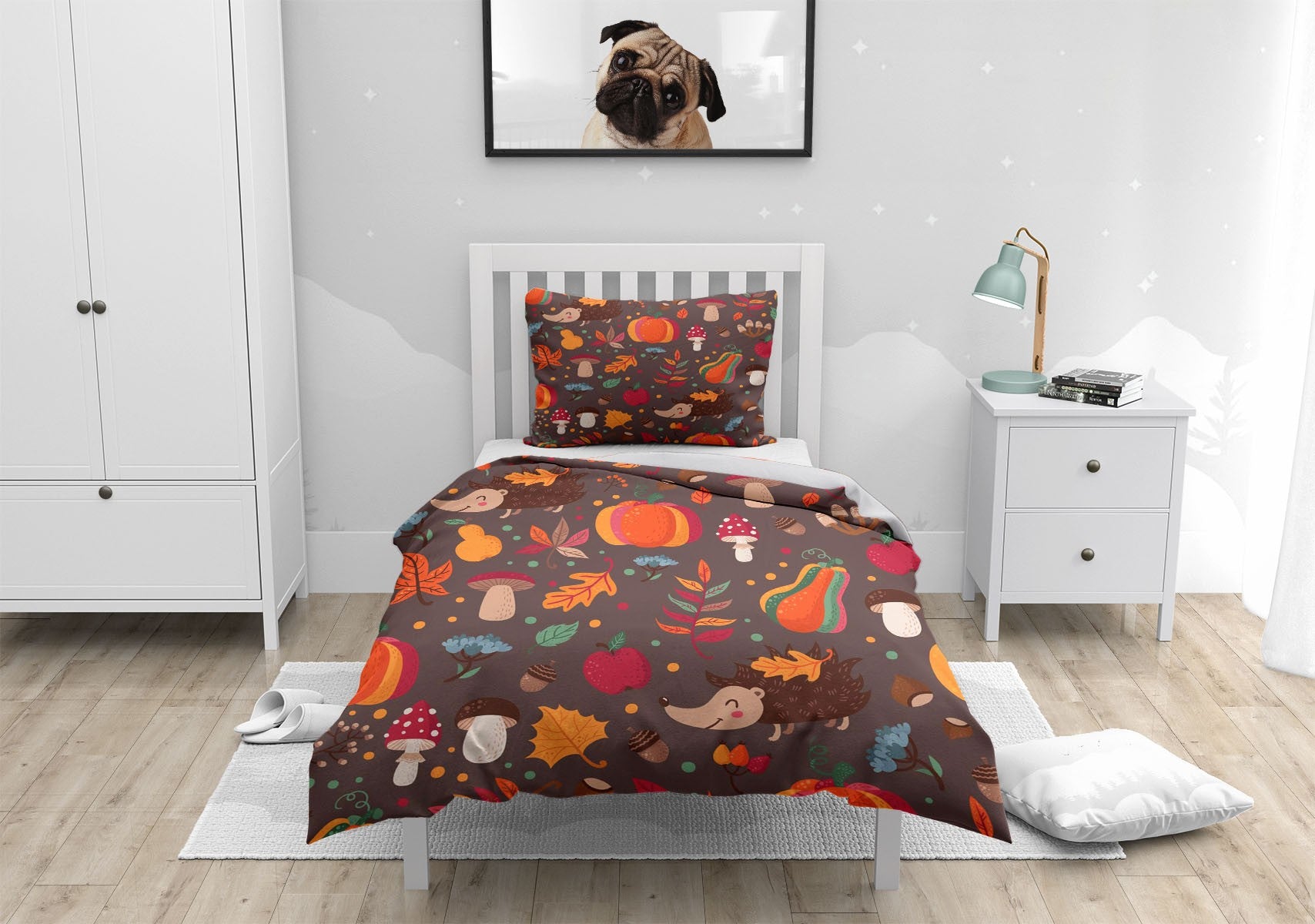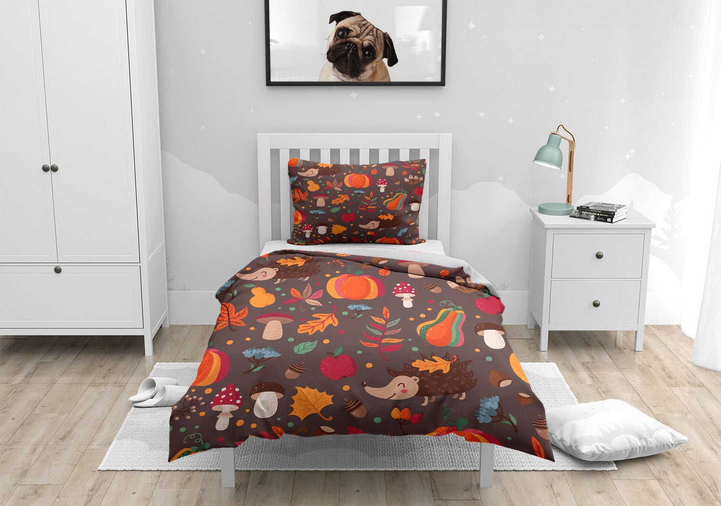 Autumn Hedgehog Pumpkin Duvet Cover Set w Pillowcases, Brown Kids Cartoon 3D Quilt Cover, 3pc Single Double Queen King Size Doona Cover