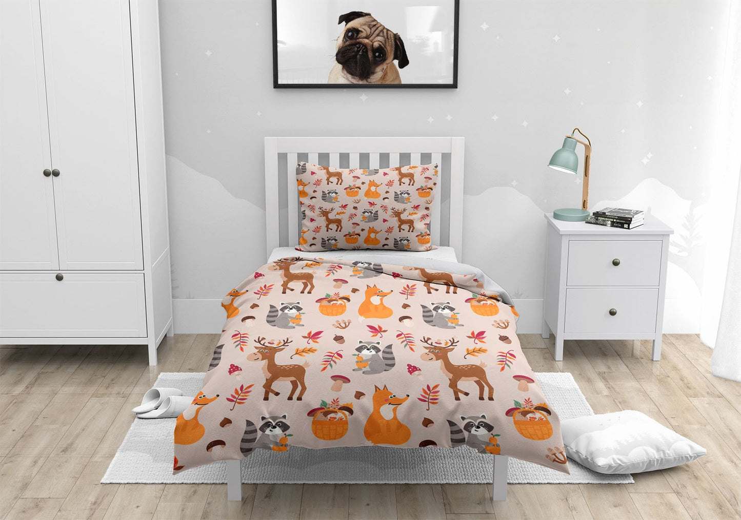 Autumn Raccoon Reindeer Duvet Cover Set w Pillowcases, Brown Kids Cartoon 3D Quilt Cover, 3pc Single Double Queen King Size Doona Cover
