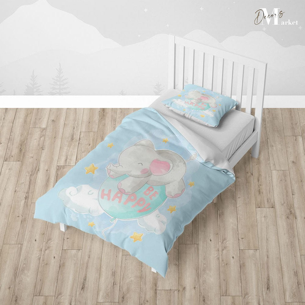Baby Elephant Balloon Duvet Cover Set w Pillow Cover, Blue Kids Animal 3D Quilt Cover, Single Double Queen King Size Doona Cover