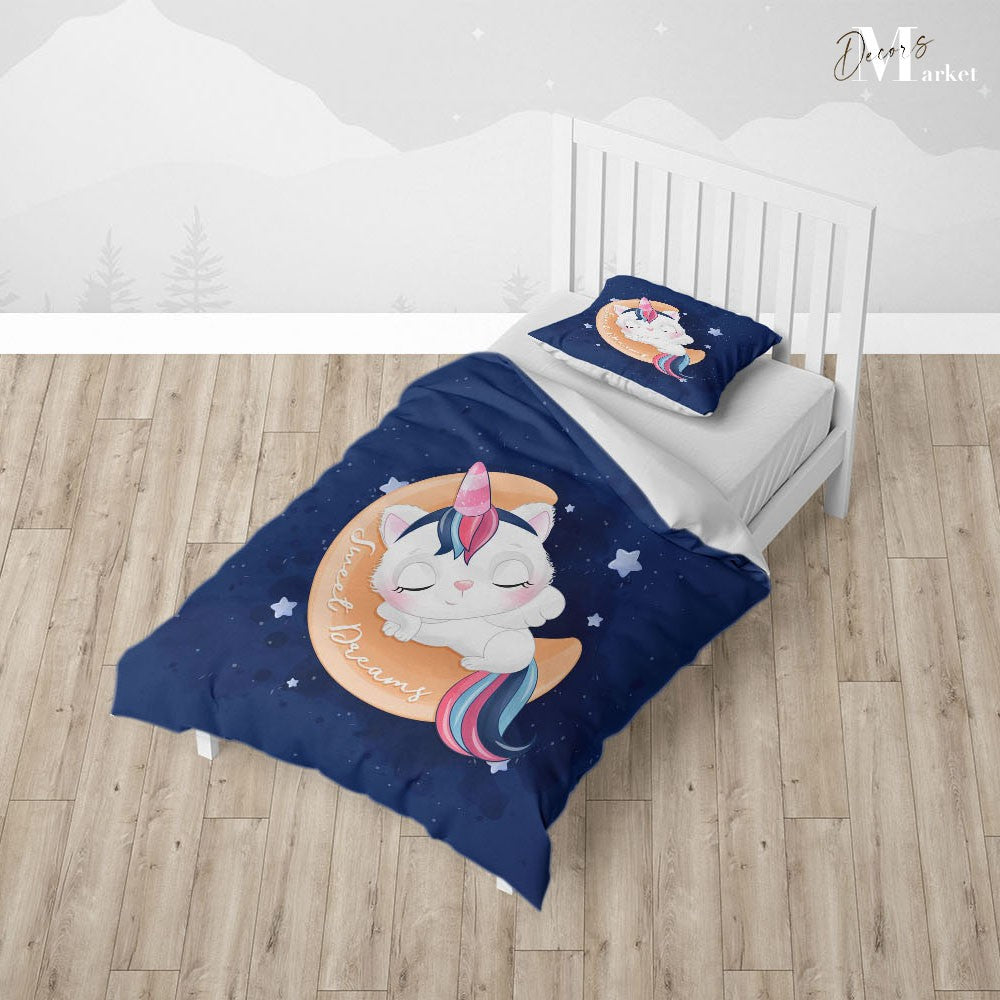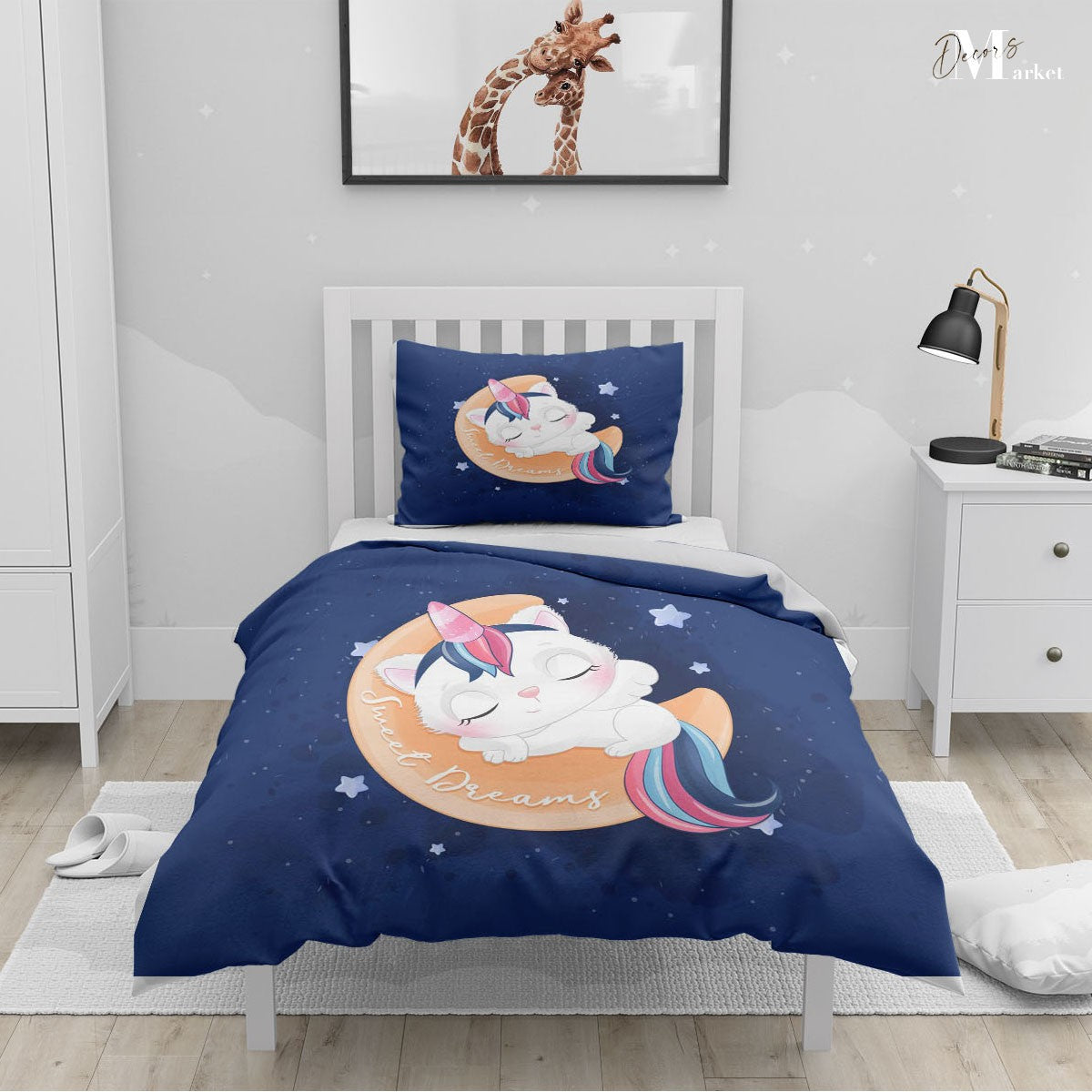 Baby Unicorn Dream Duvet Cover Set w Pillow Cover, Blue Kids Cartoon 3D Quilt Cover, Single Double Queen King Size Doona Cover