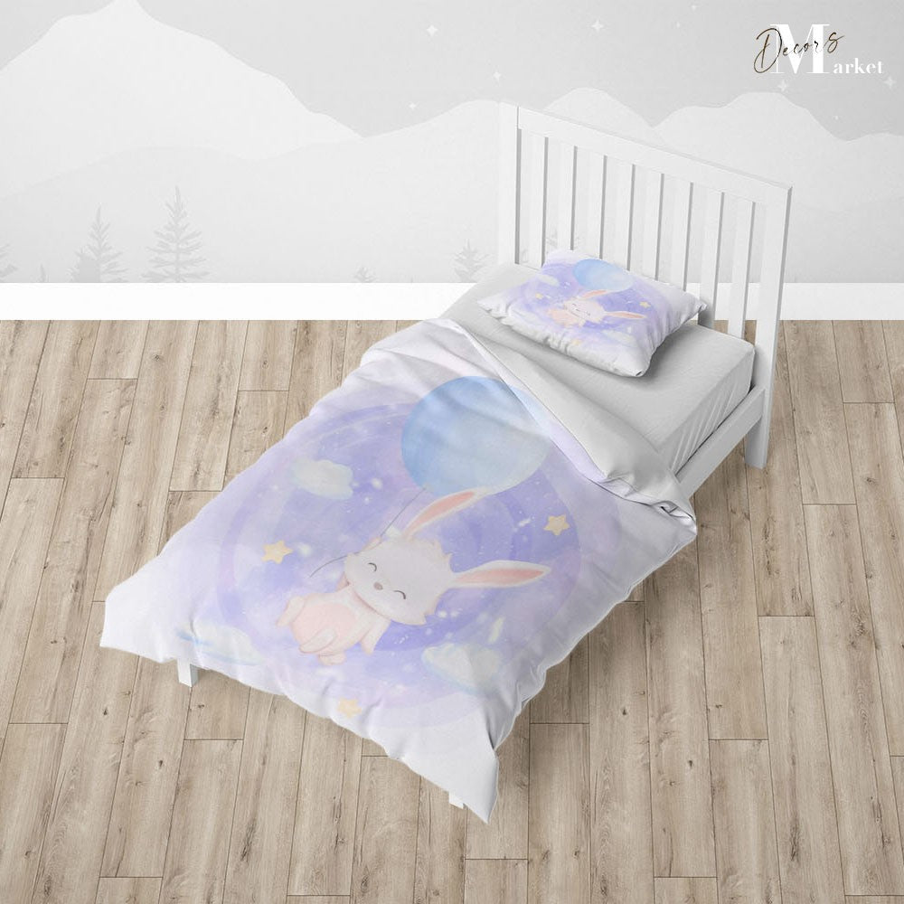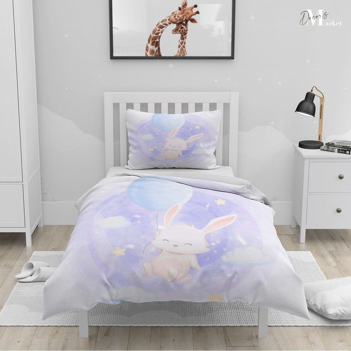 Balloon Rabbit Fly Duvet Cover Set w Pillow Cover, Purple Art Watercolor 3D Quilt Cover, Single Double Queen King Size Doona Cover