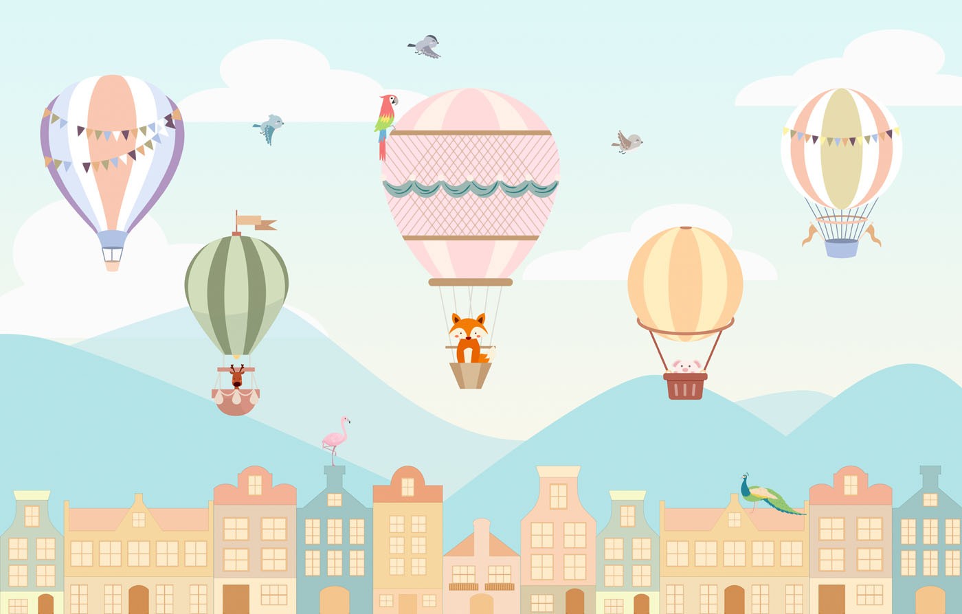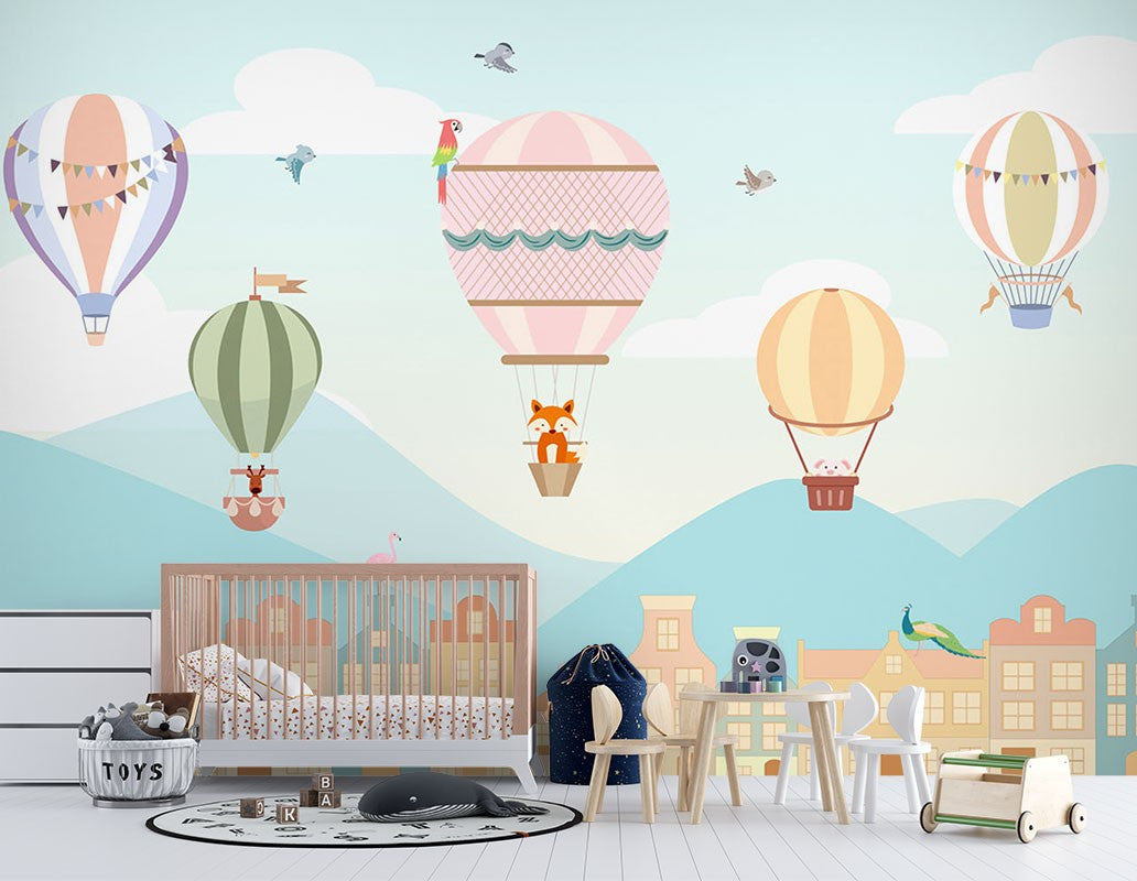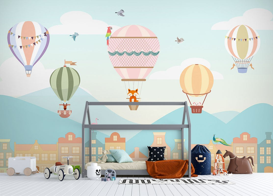 Balloons Houses Kids Cartoon Multicolour Wallpaper Mural,Self-Adhesive Peel And Stick 3D Wall Art,Removable Bedroom Wall Decor