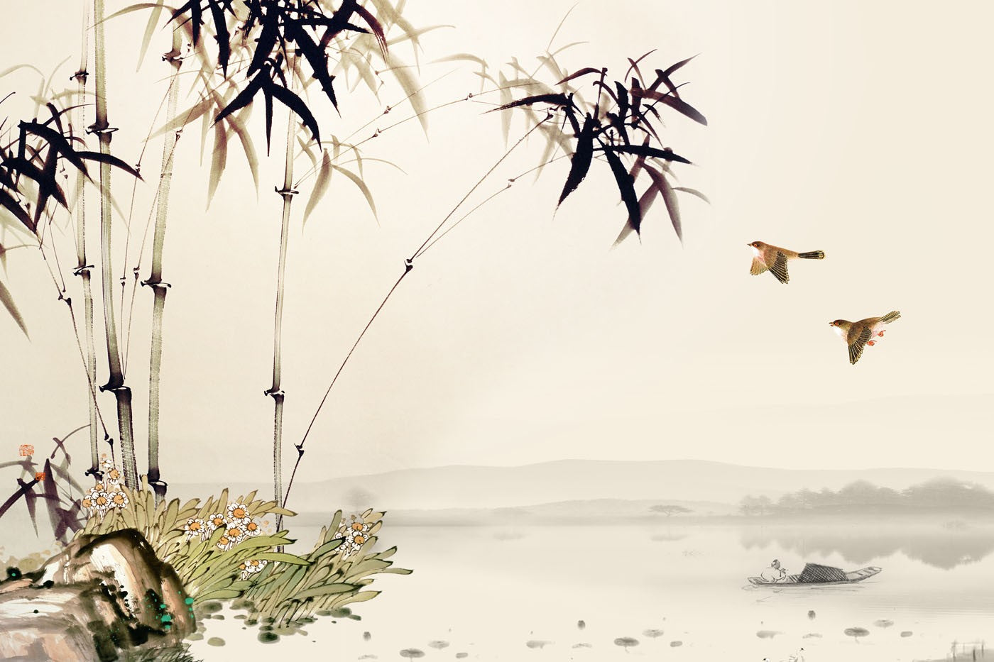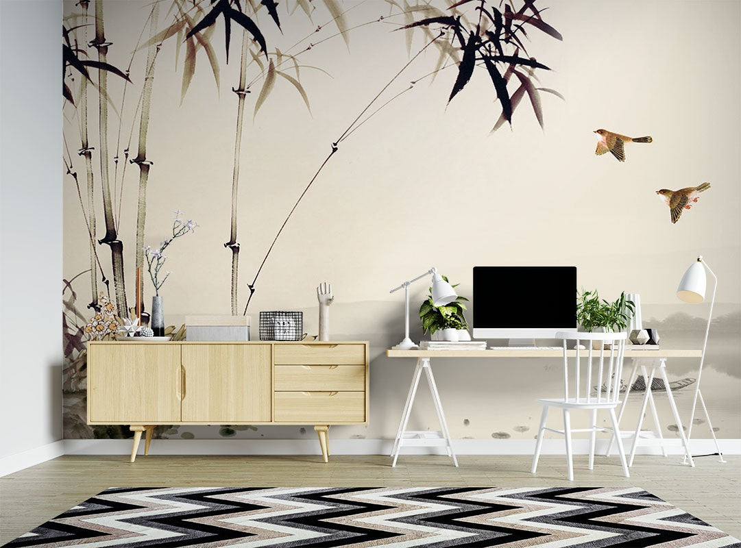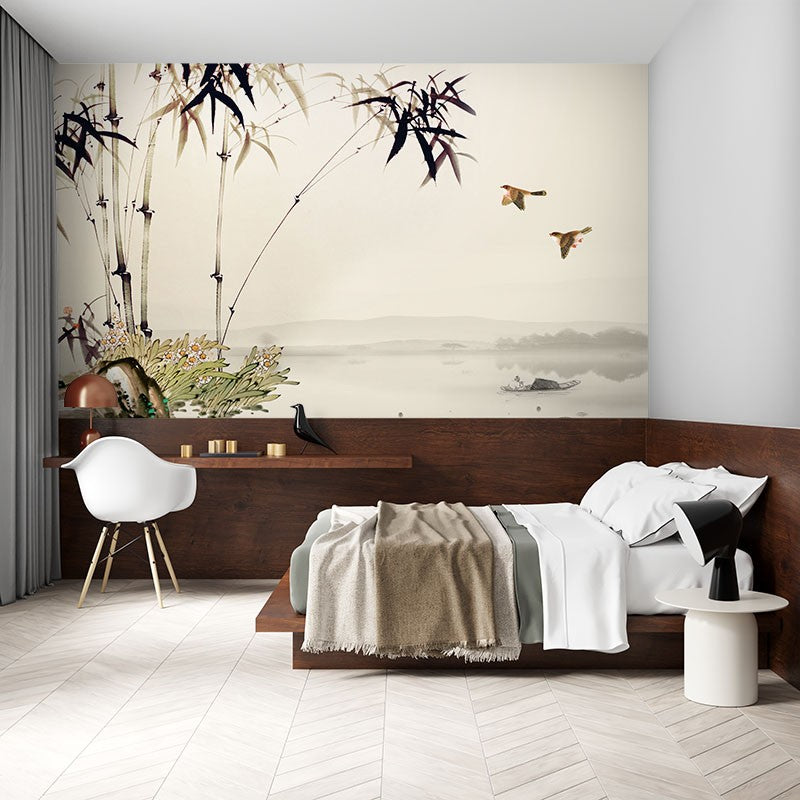 Bamboo Thrush Art Chinoiserie Creamy Wallpaper Mural,Self-Adhesive Peel And Stick 3D Wall Paper,Bedroom Removable Wall Decor