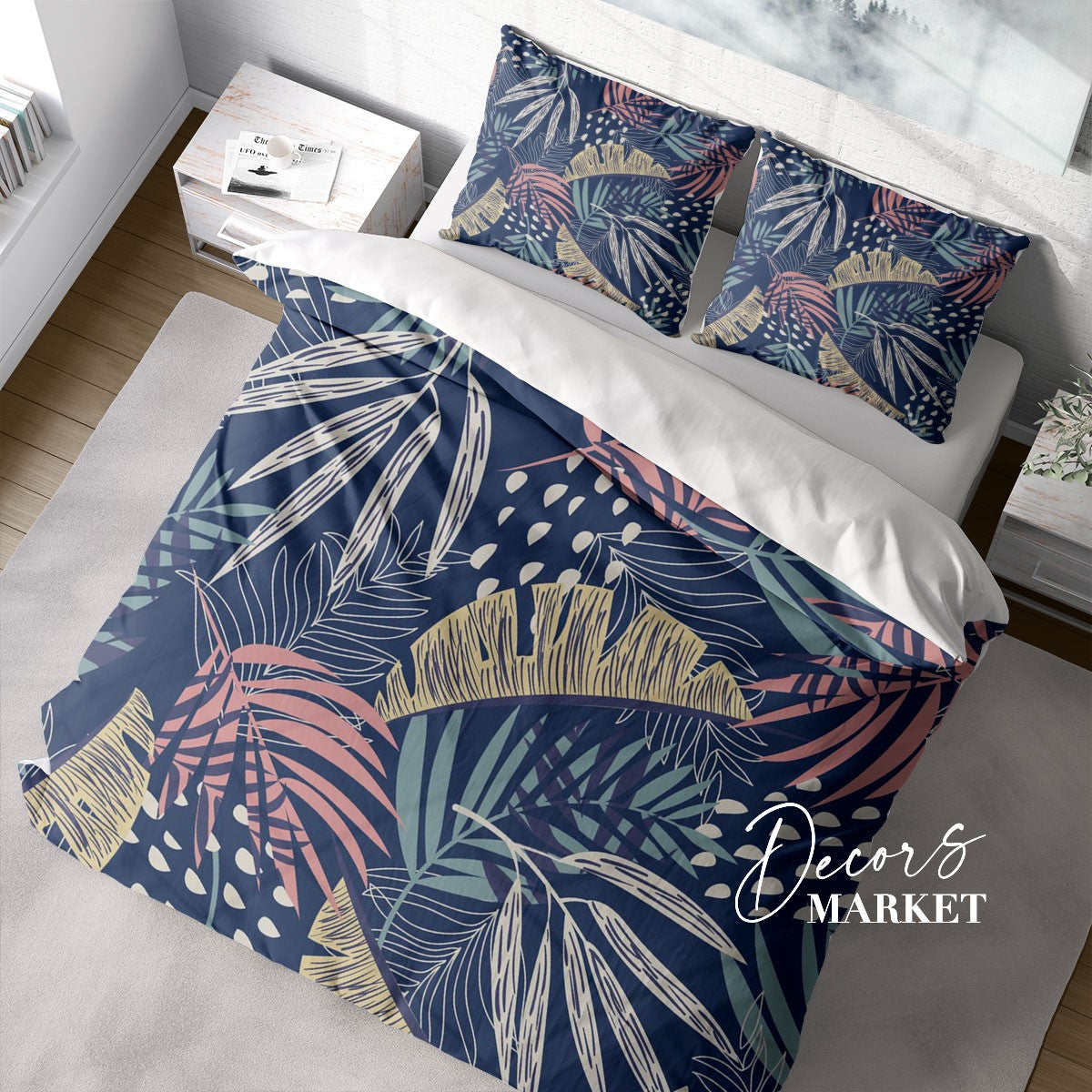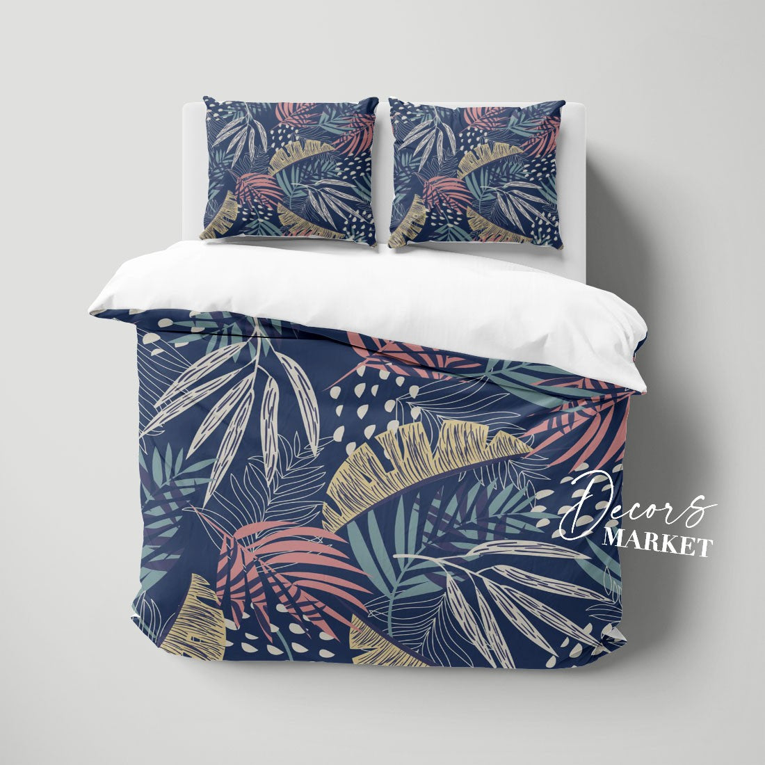Banana Leaves Duvet Cover Set w Pillowcases, Blue bg Tropical Floral Leaves 3D Quilt Cover, 3pc Single Double Queen King Size Doona Cover