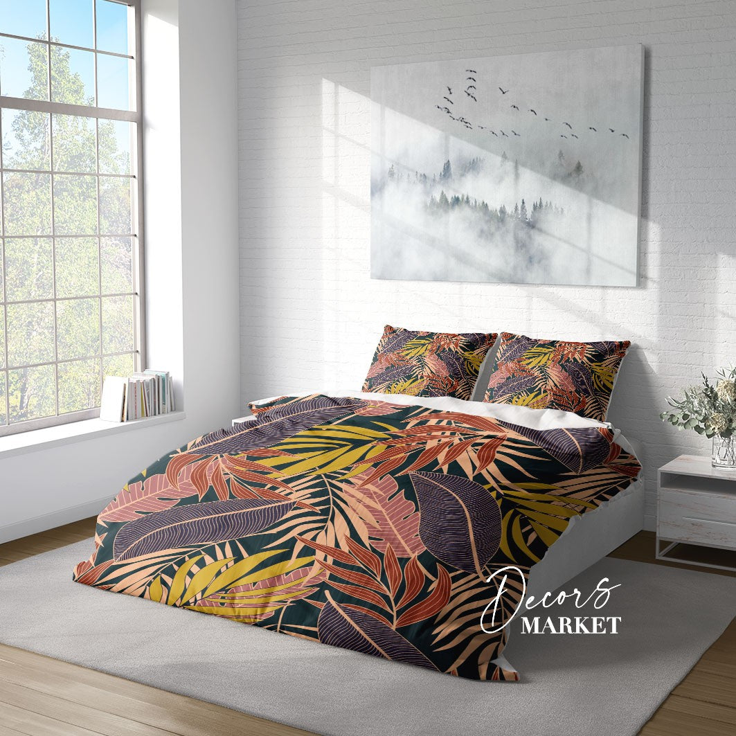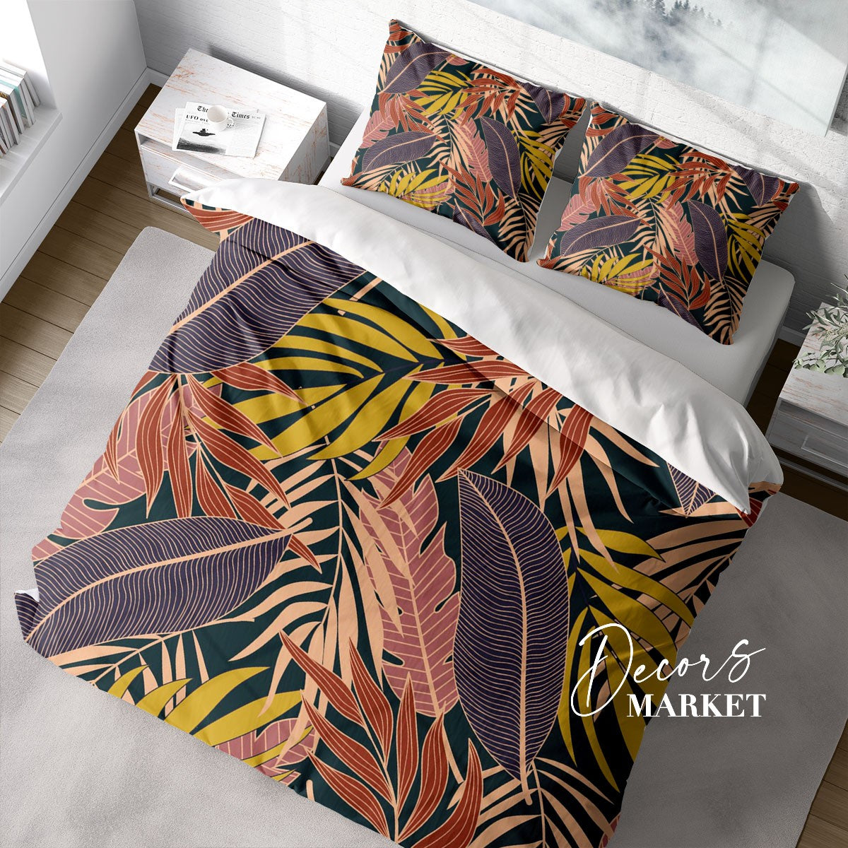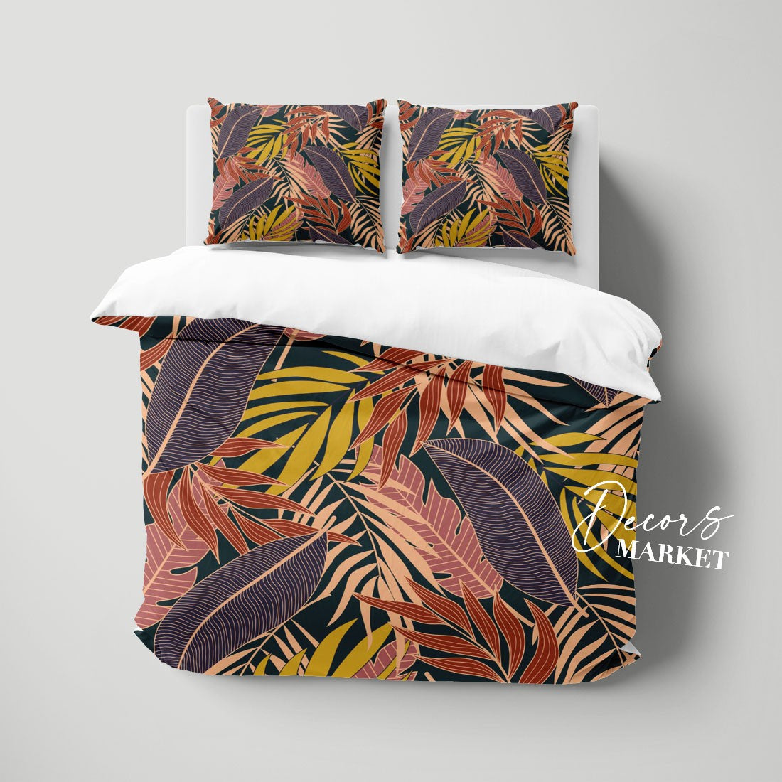 Banana Leaves Duvet Cover Set w Pillowcases, Dark bg Tropical Floral Leaves 3D Quilt Cover, 3pc Single Double Queen King Size Doona Cover