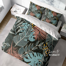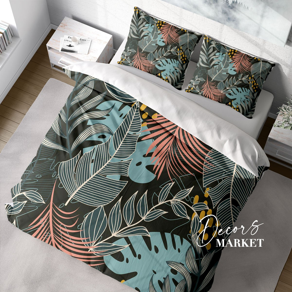 Banana Leaves Duvet Cover Set w Pillowcases, Black bg Tropical Floral Leaves 3D Quilt Cover, 3pc Single Double Queen King Size Doona Cover
