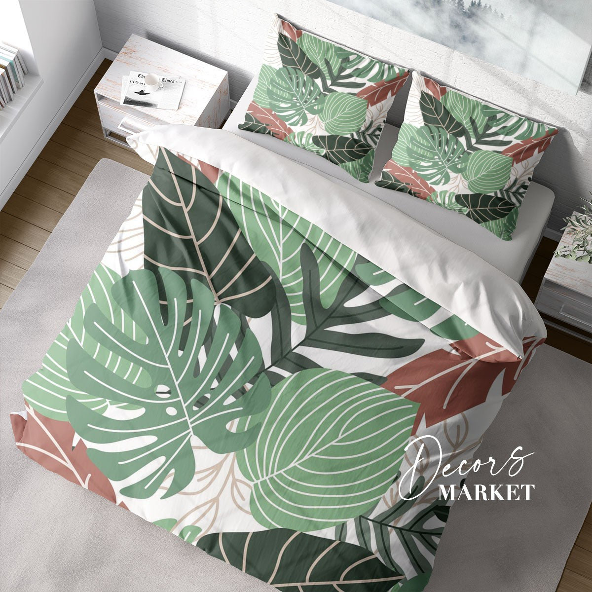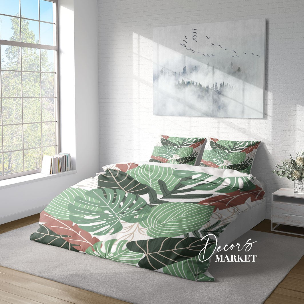 Banana Leaves Duvet Cover Set w Pillowcases, Green Floral Leaves 3D Quilt Cover, 3pc Single Double Queen King Size Doona Cover