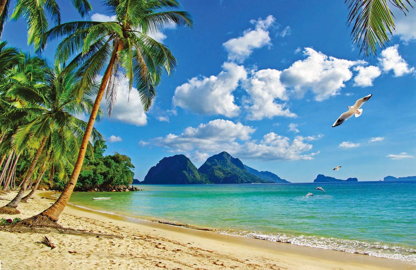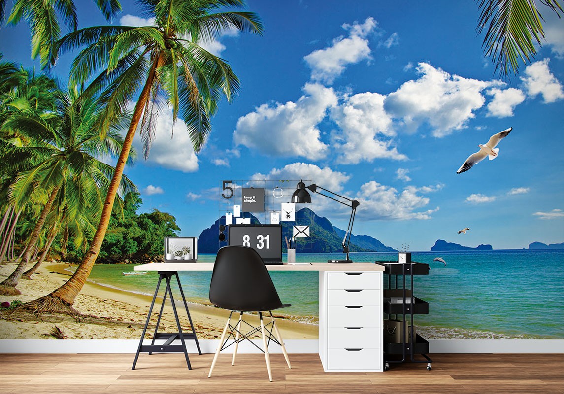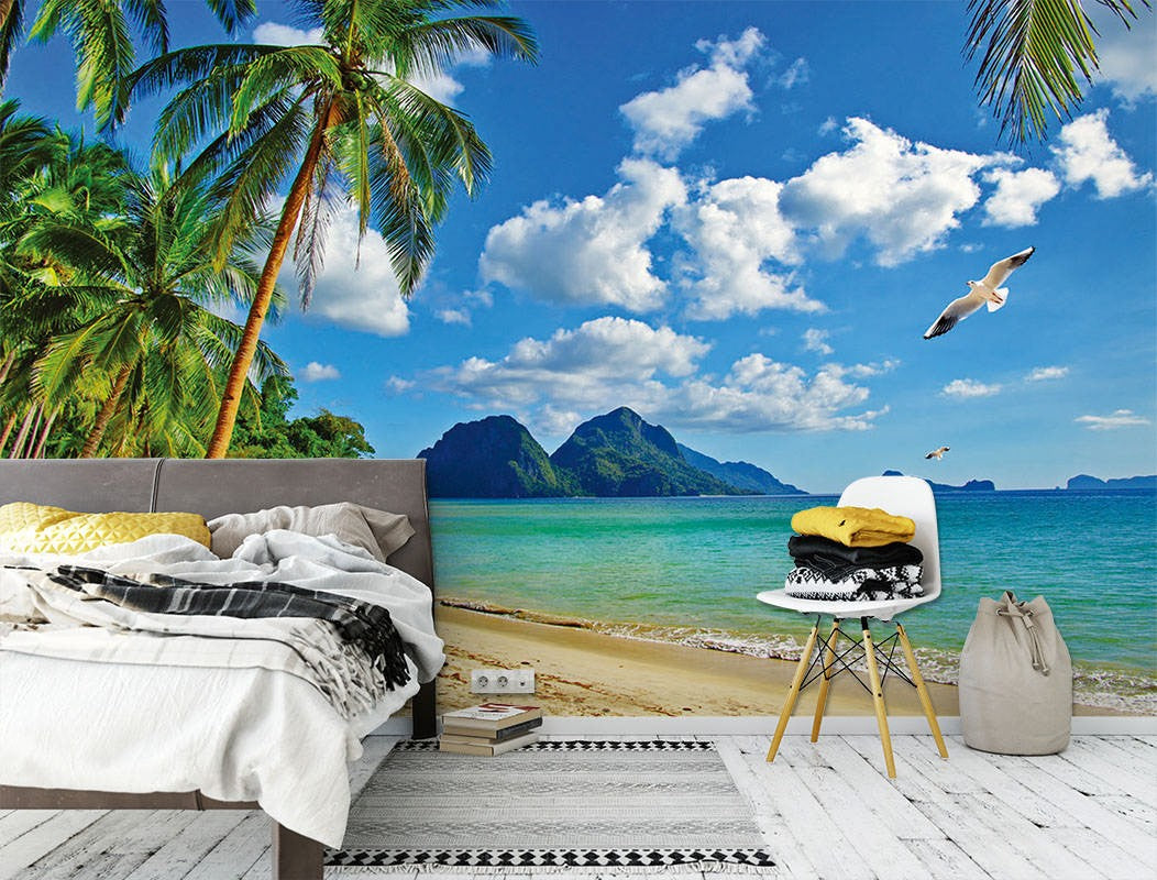 Beach Seagull Palm Tree Blue Wallpaper Mural,Self-Adhesive Peel And Stick 3D Wall Paper,Australian Company Designer Wall Decor