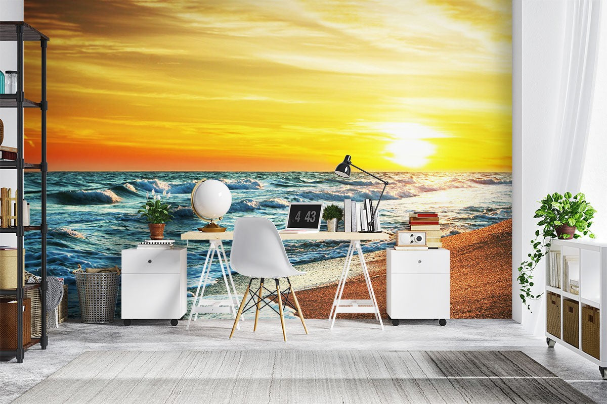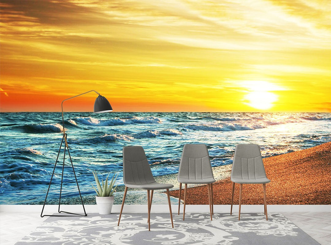 Beach Wave Sunrise Sunset Orange Wallpaper Mural,Self-Adhesive Peel And Stick 3D Wall Decal,Australian Company Wall Decor