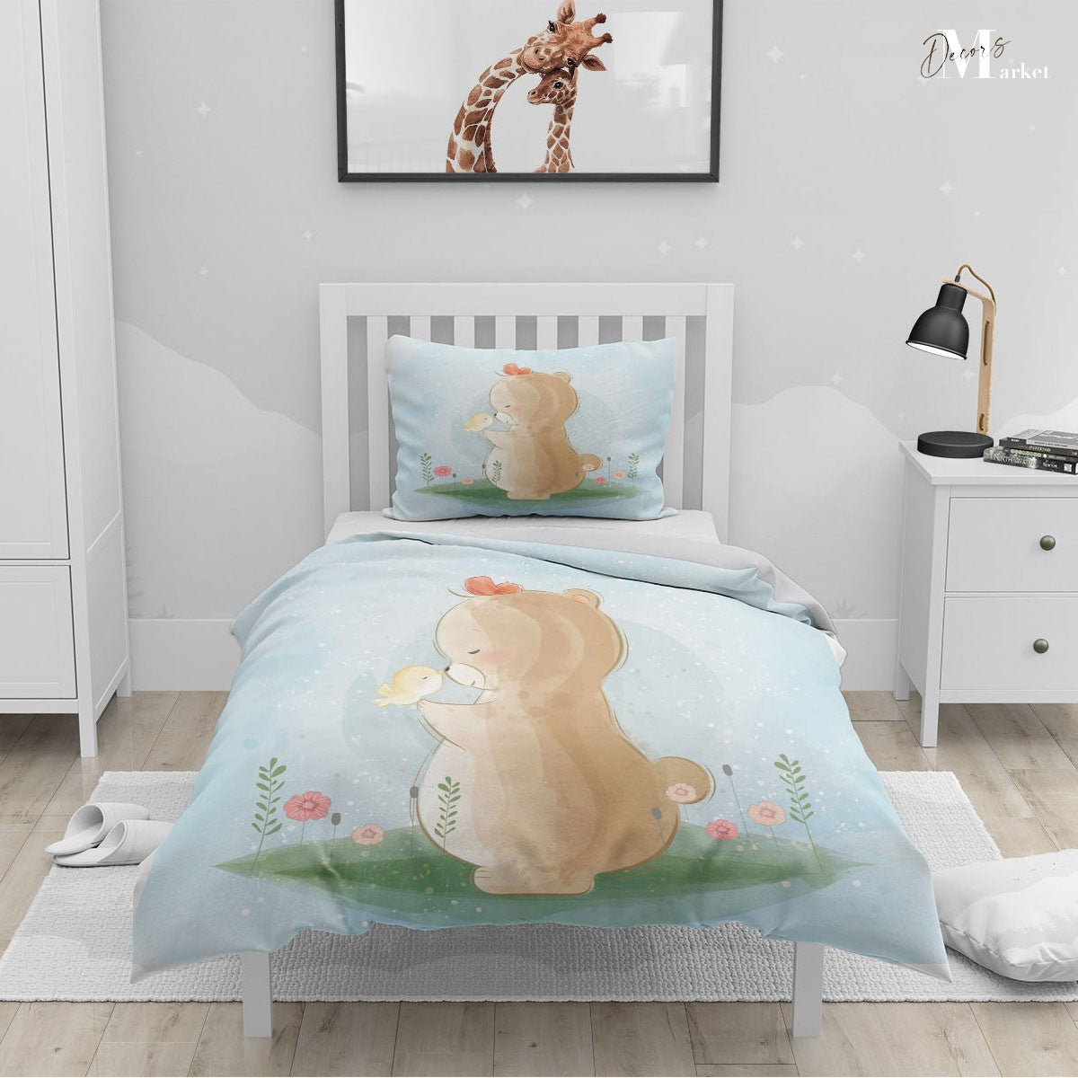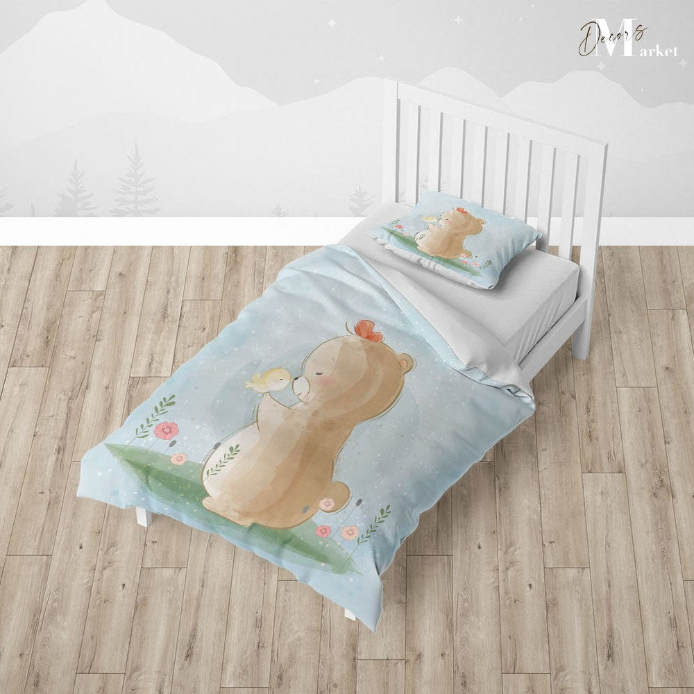 Bear Kiss Bird Duvet Cover Set w Pillow Cover, Blue Kids Cartoon 3D Quilt Cover, Single Double Queen King Size Doona Cover