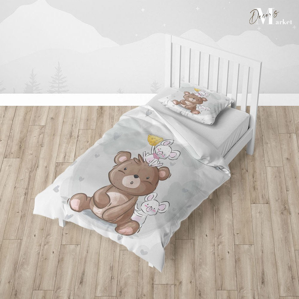 Bear Mouse Cheese Duvet Cover Set w Pillow Cover, Gray Kids Cartoon 3D Quilt Cover, Single Double Queen King Size Doona Cover