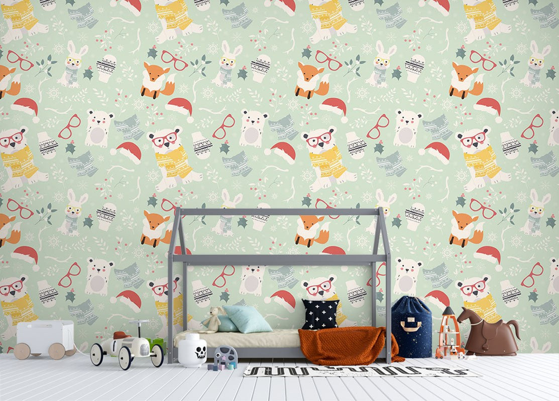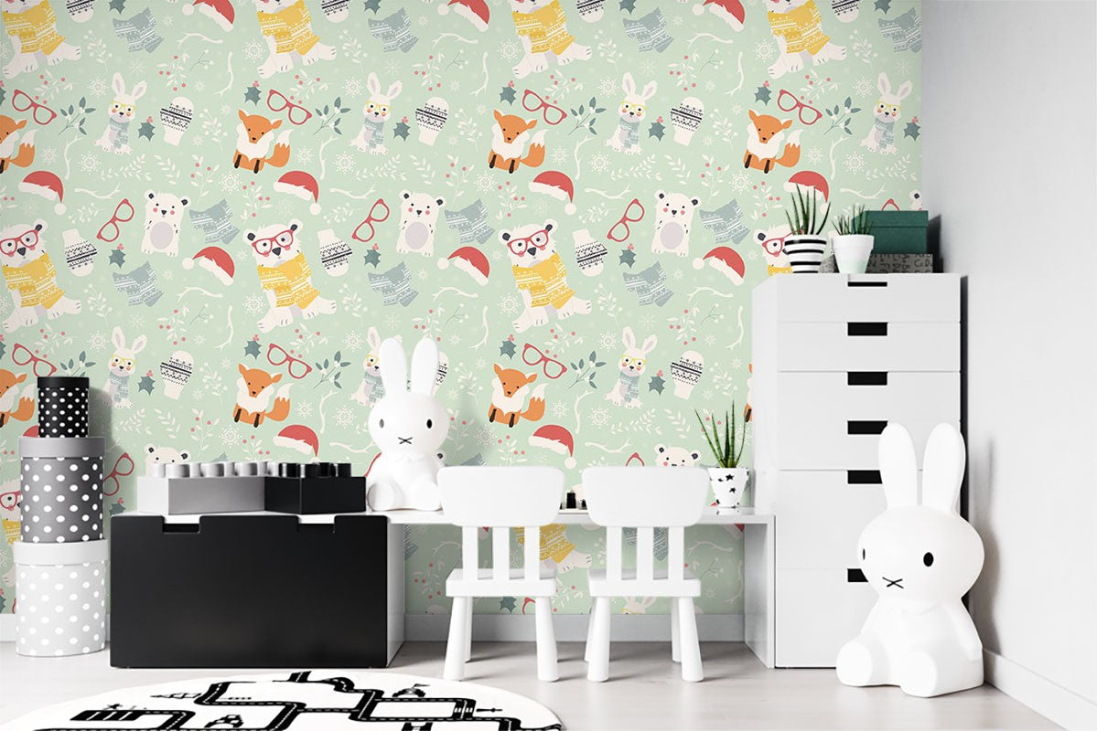 Bear Rabbit Wolf Kids Patterns Green Wallpaper Mural,Self-Adhesive Peel And Stick 3D Wall Decal,Australian Company Removable Wall Decor