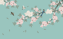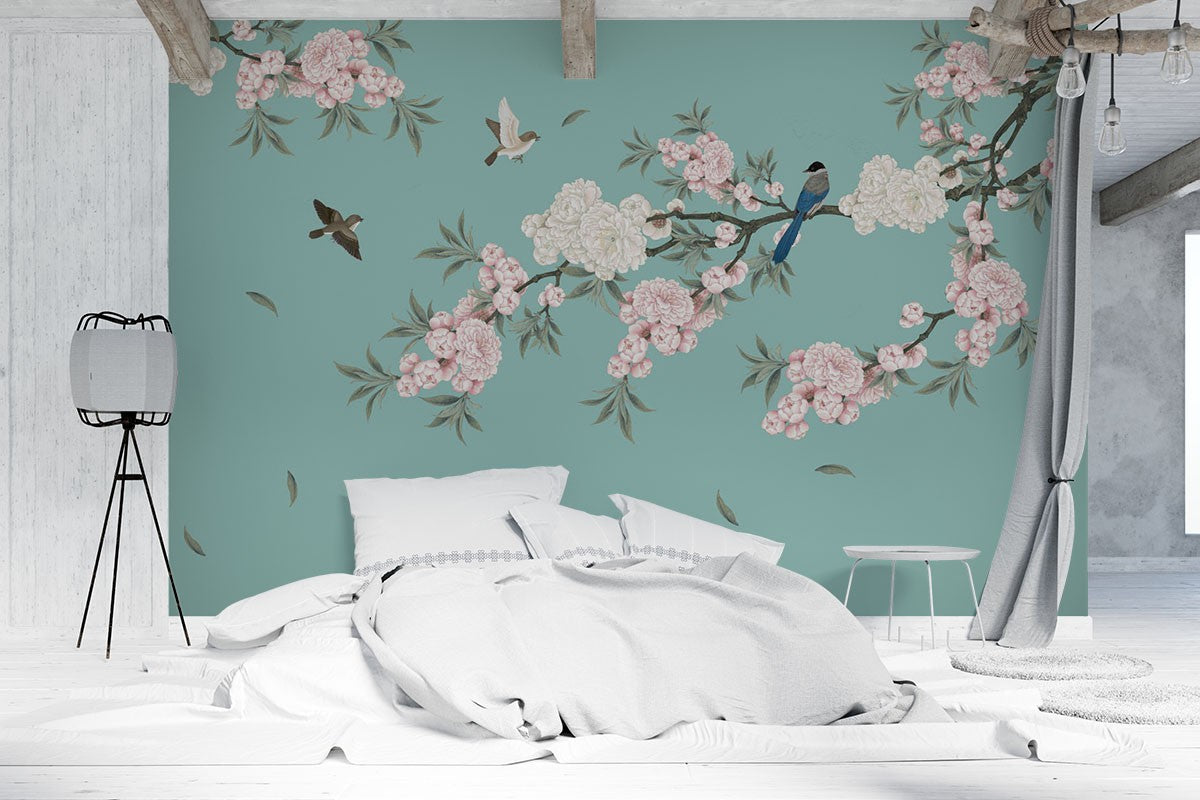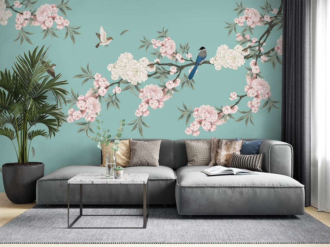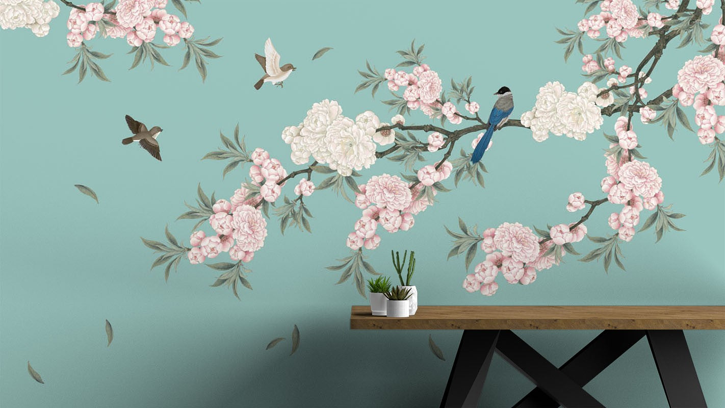 Begonia Flowers Art Chinoiserie Blue Wallpaper Mural