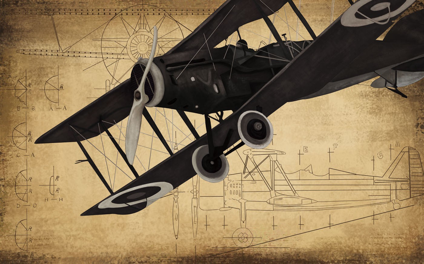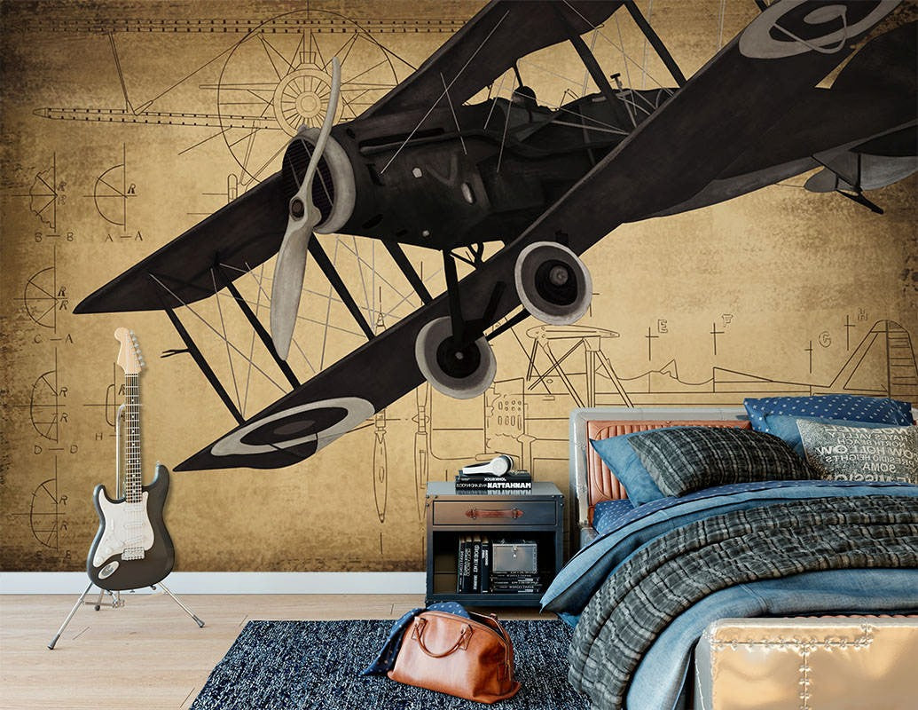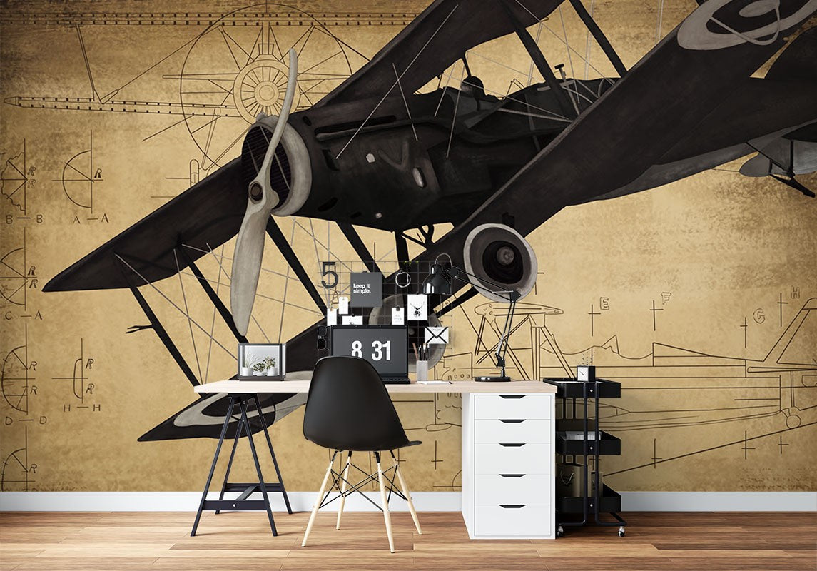 Biplane Blueprint Air Transport Brown Wallpaper Mural,Self-Adhesive Peel And Stick 3D Wall Decal,Designer Australian Company Wall Decor