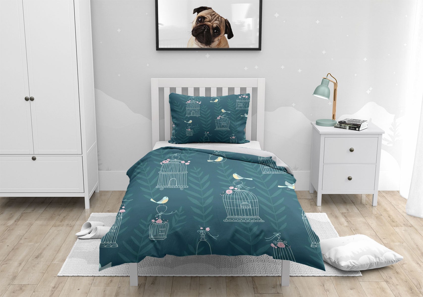 Bird Cage Leaves Duvet Cover Set w Pillowcases, Green Kids Cartoon 3D Quilt Cover, 3pc Single Double Queen King Size Doona Cover