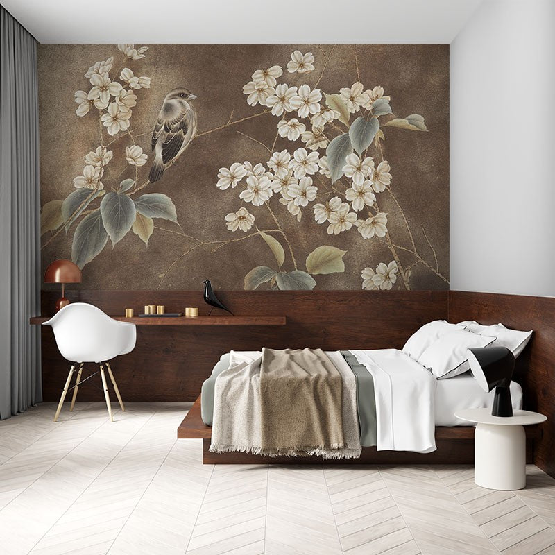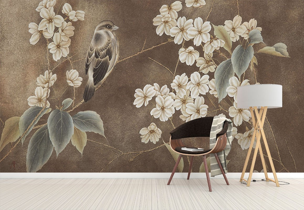 Bird Dutch Flowers Art Chinoiserie Brown Wallpaper Mural,Self-Adhesive Peel And Stick 3D Wall Paper,Designer Bedroom Wall Decor