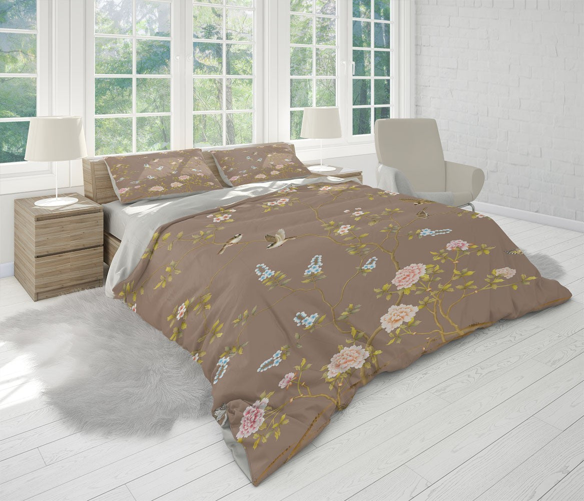 Birds Flowers Duvet Cover Set W Pillow Cover, Brown Art Chinoiserie 3D Quilt Cover, Single Double Queen King Size Doona Cover