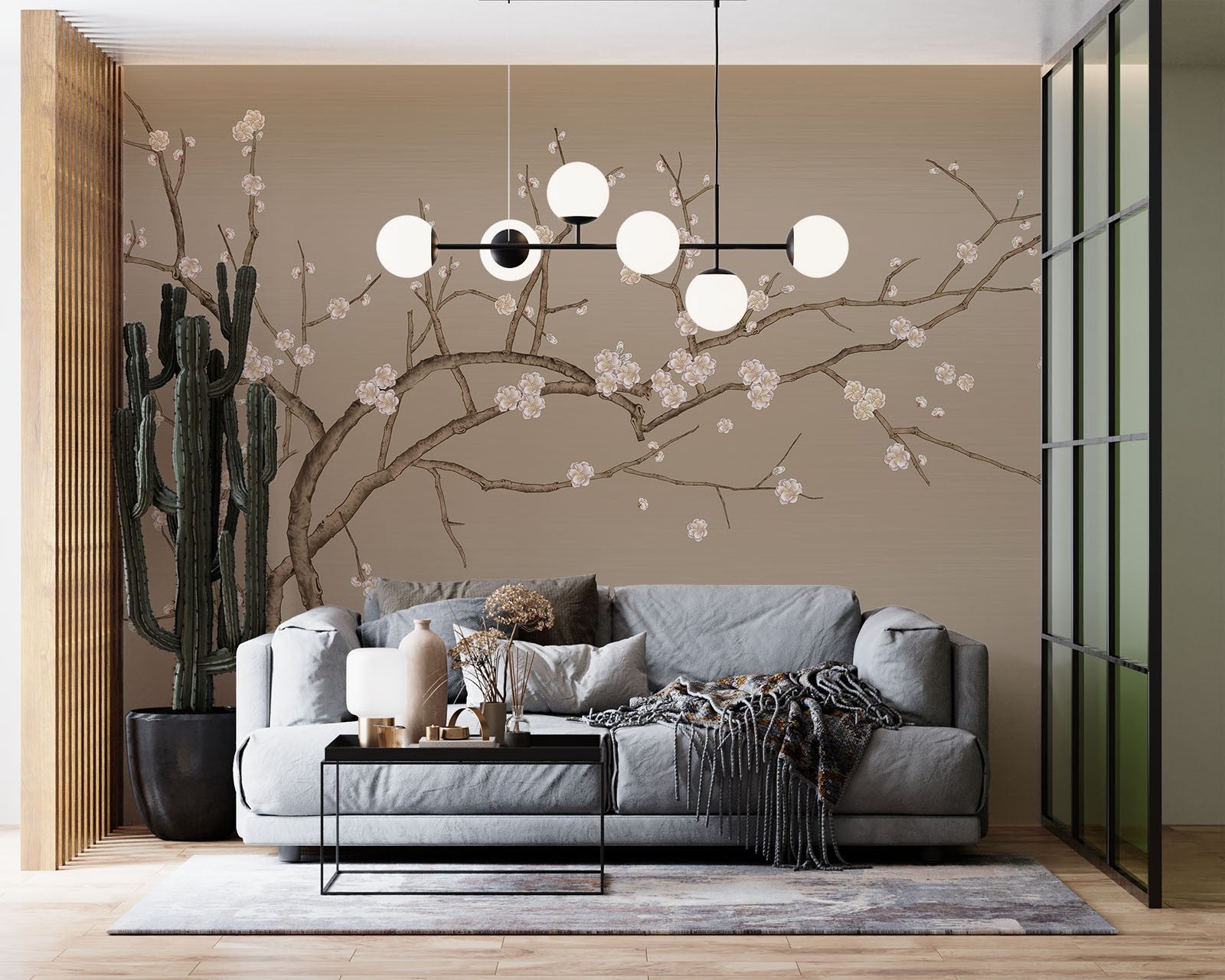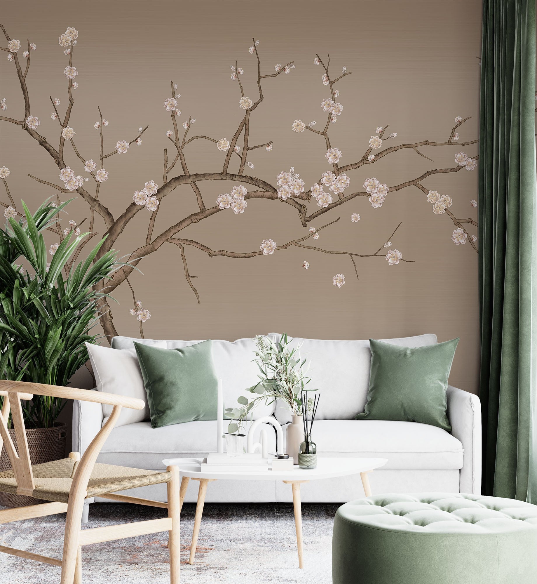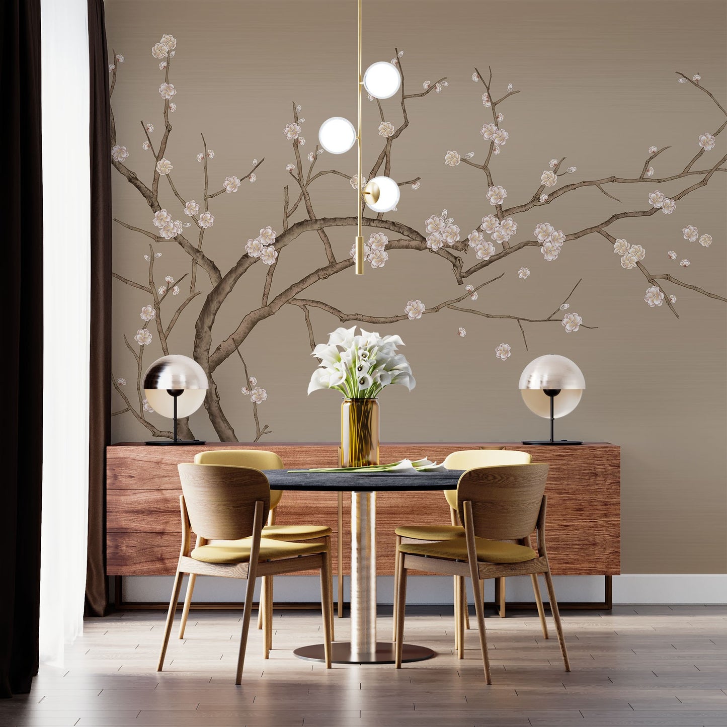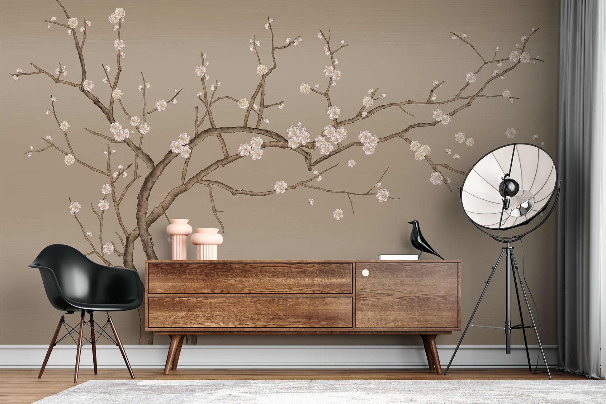Blooming Tree Art Chinoiserie Brown Wallpaper Mural