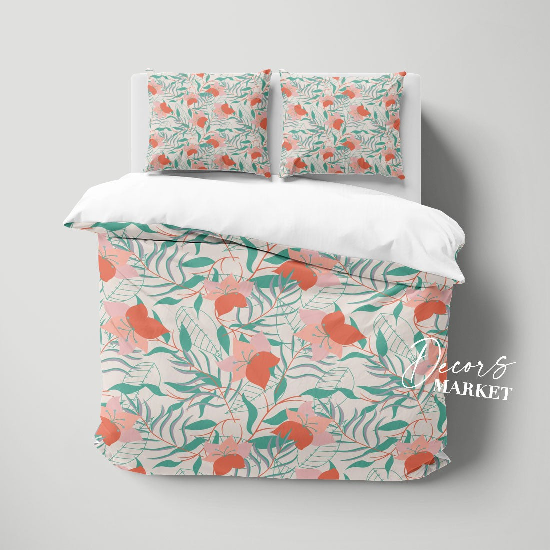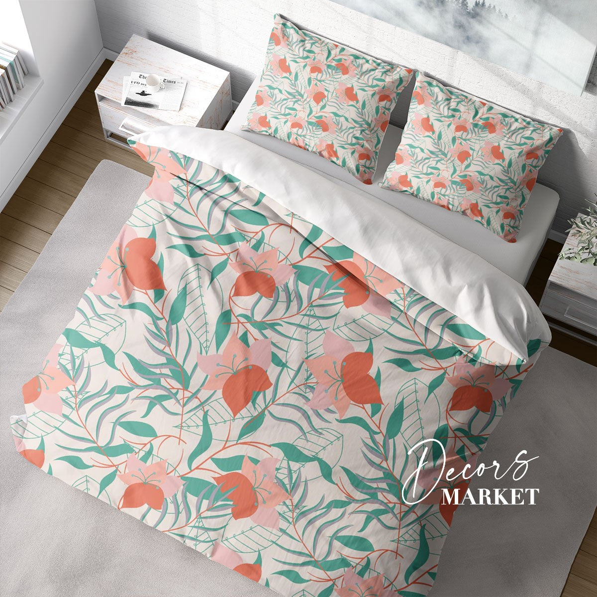 Blossom Botanical Flower Duvet Cover Set w Pillowcases, Green Floral Patterns 3D Quilt Cover, 3pc Single Double Queen King Size Doona Cover