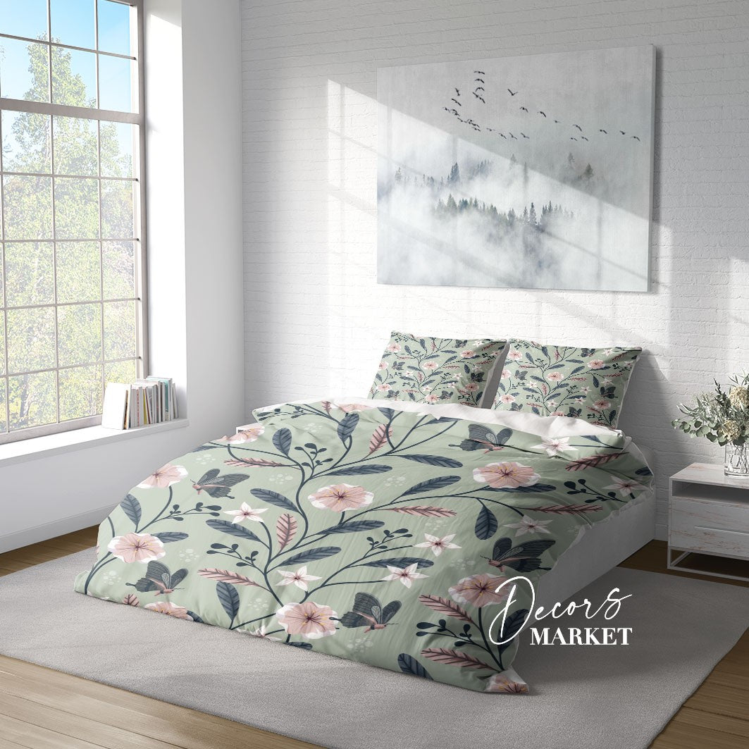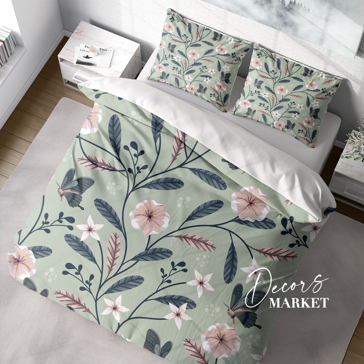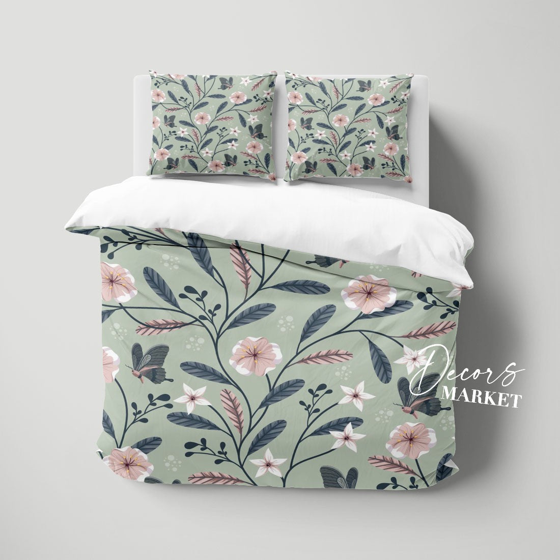 Blossom Flower Butterfly Duvet Cover Set w Pillowcases, Green Floral Patterns 3D Quilt Cover, 3pc Single Double Queen King Size Doona Cover