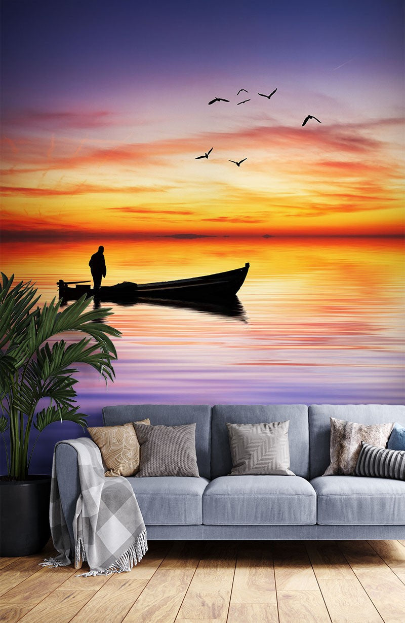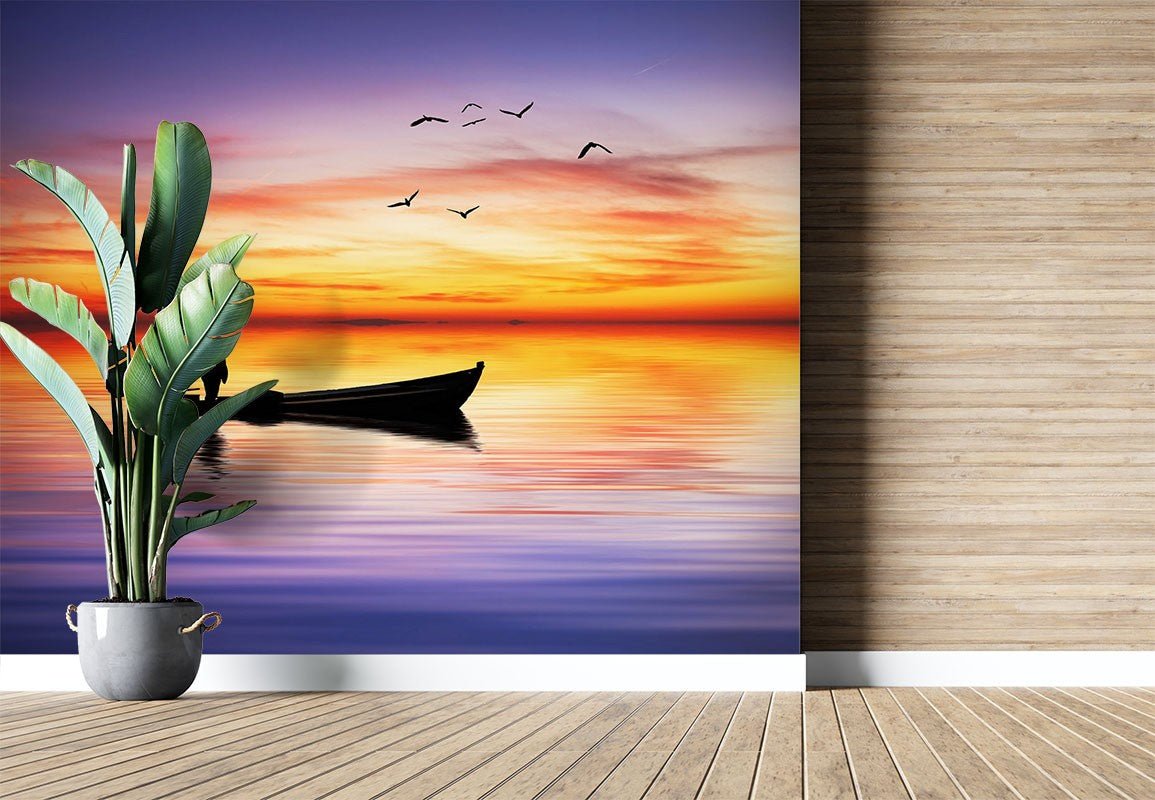 Boat On Lake Nature Sky Orange Wallpaper Mural,Self-Adhesive Peel And Stick 3D Wall Decal,Designer Bedroom Wall Decor