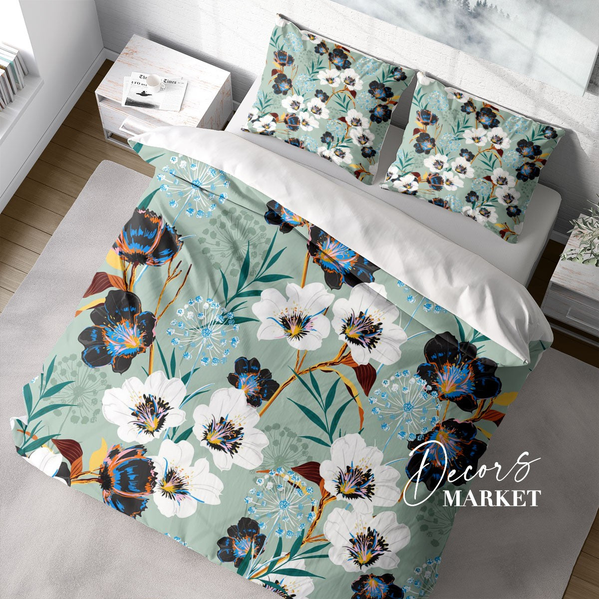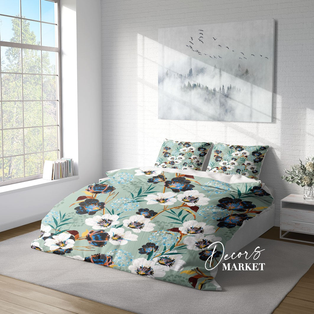 Botanical Blossom Flower Duvet Cover Set w Pillowcases, Green Floral Patterns 3D Quilt Cover, 3pc Single Double Queen King Size Doona Cover