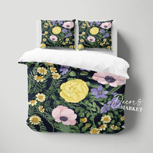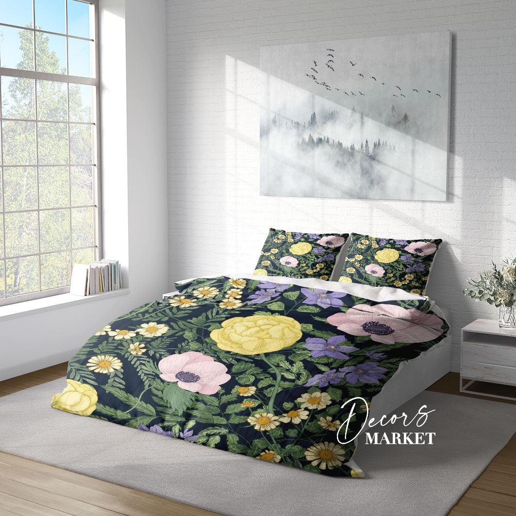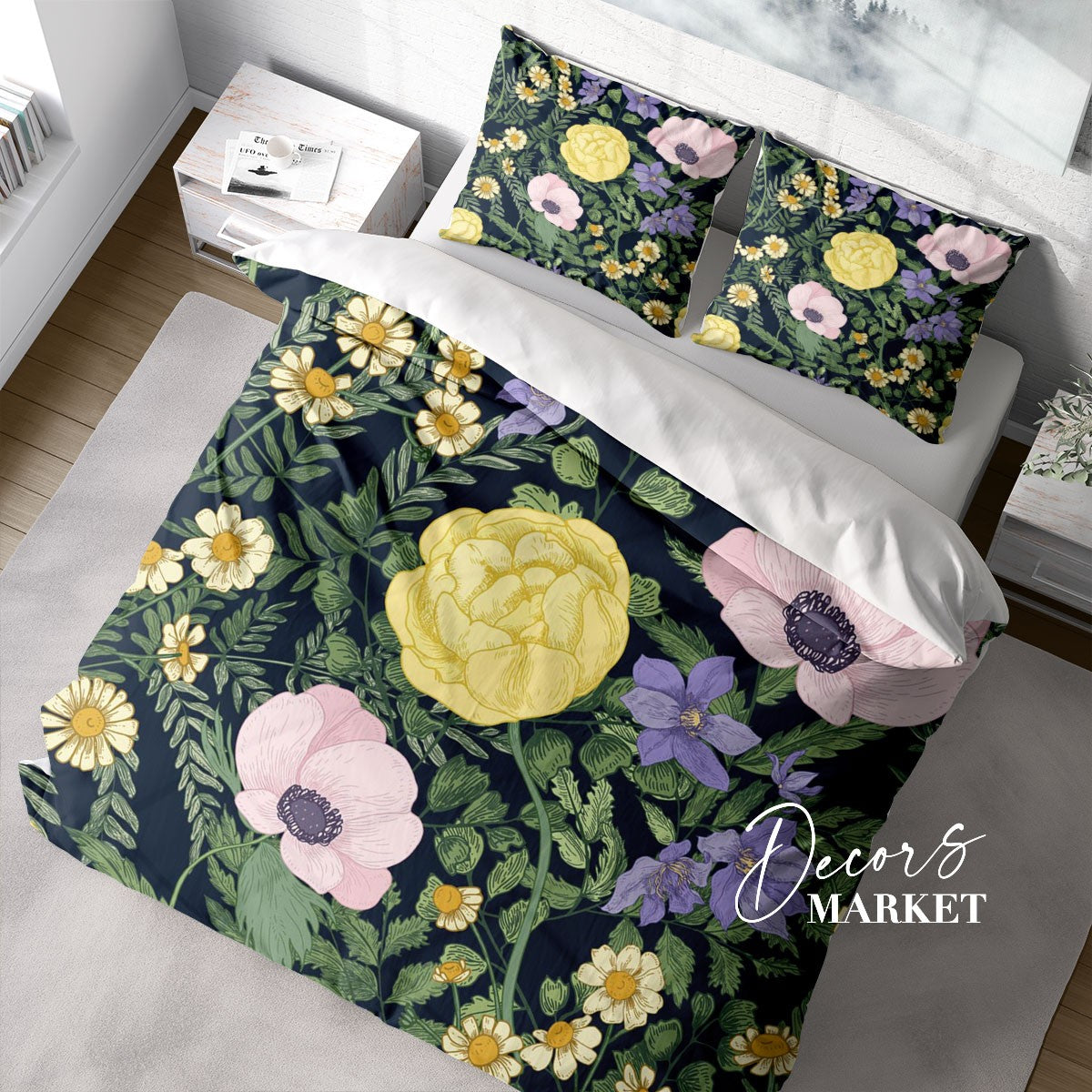 Botanical Chamomile Flowers Duvet Cover Set w Pillowcases, Dark Green Floral Patterns 3D Quilt Cover, 3pc Double Queen King Size Doona Cover