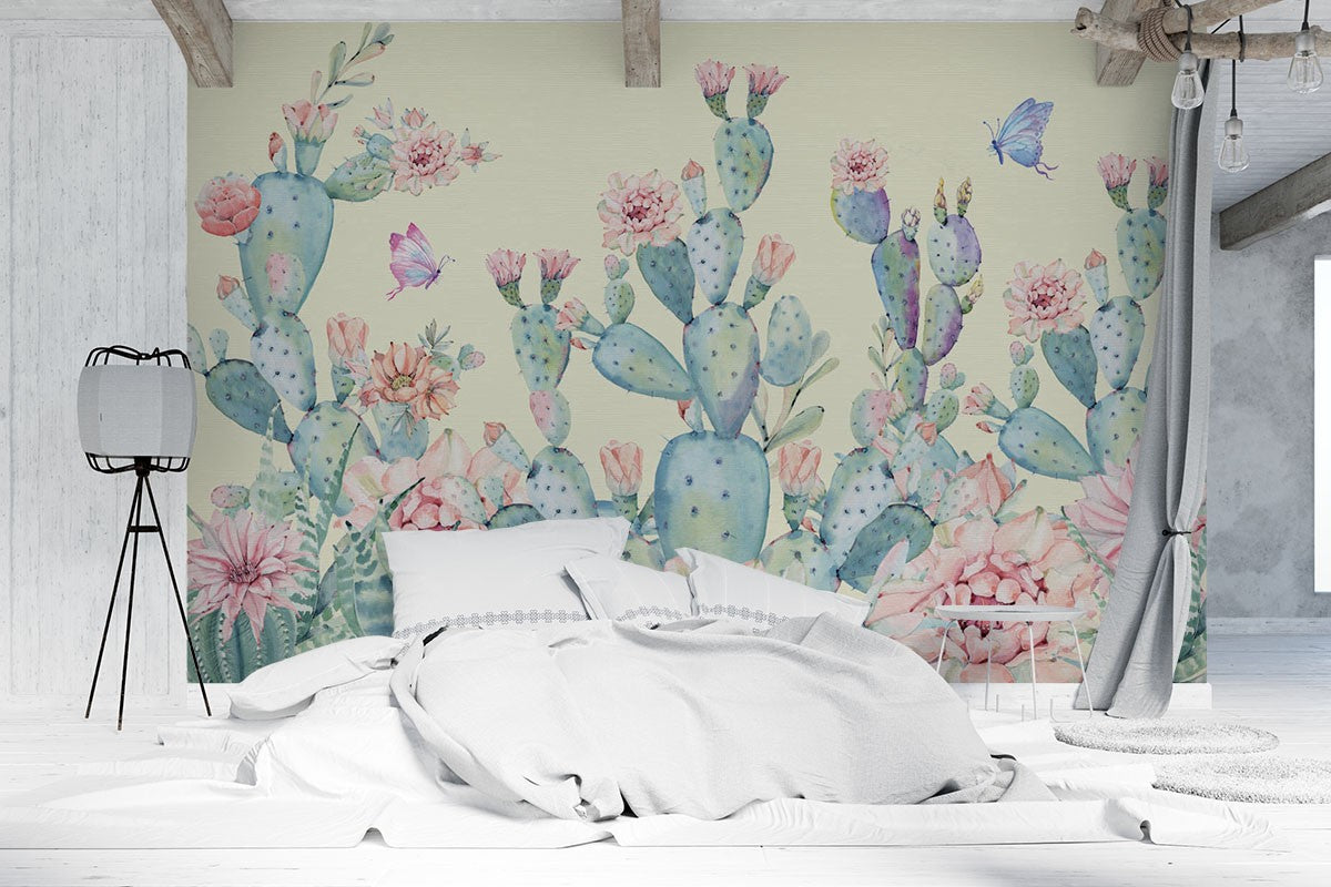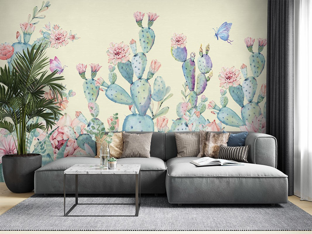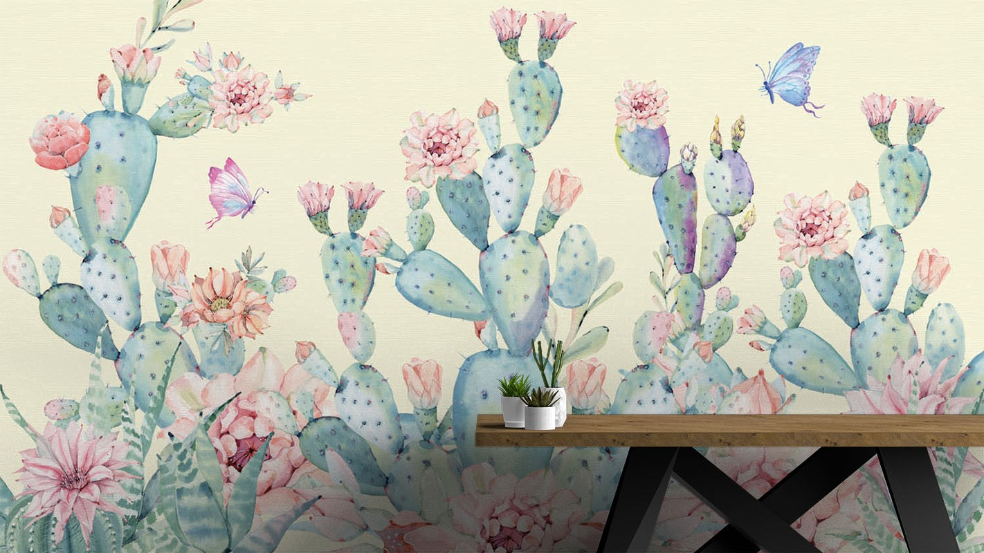 Butterfly Cactus Art Watercolor Green Wallpaper Mural