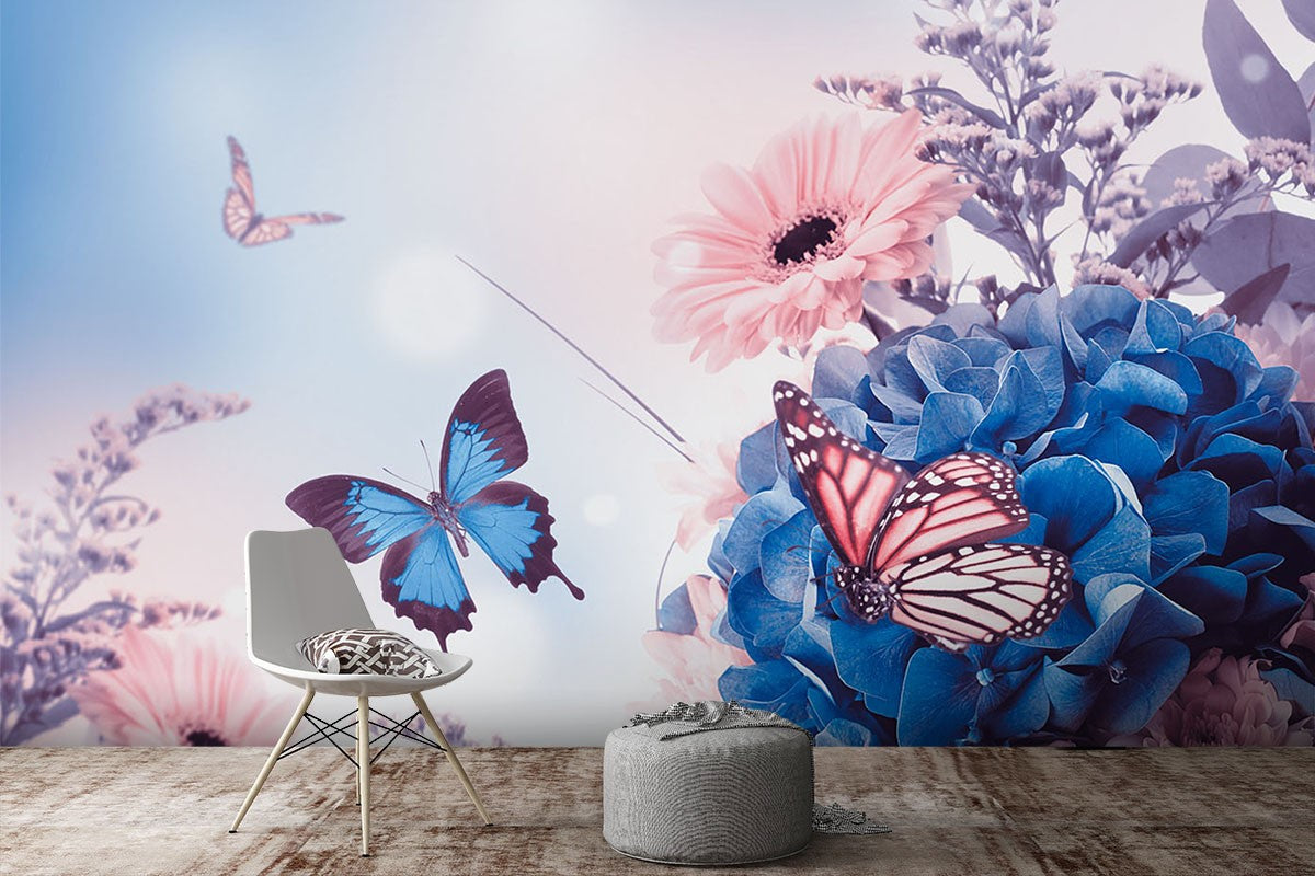 Butterfly Violet Floral Dutch Flowers Blue Wallpaper Mural,Self-Adhesive Peel And Stick 3D Wall Decor,Designer Bedroom Wall Decor