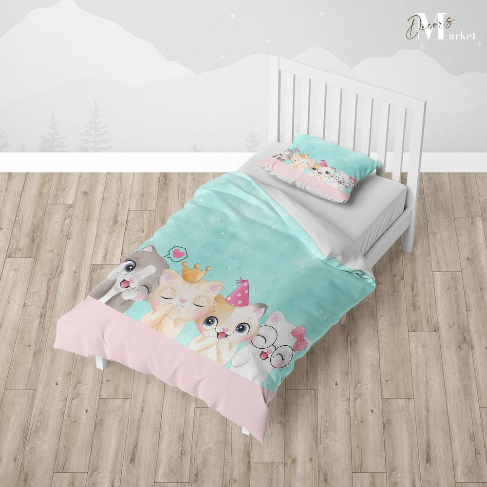 Cat Baby Family Duvet Cover Set w Pillow Cover, Green Kids Cartoon 3D Quilt Cover, Single Double Queen King Size Doona Cover