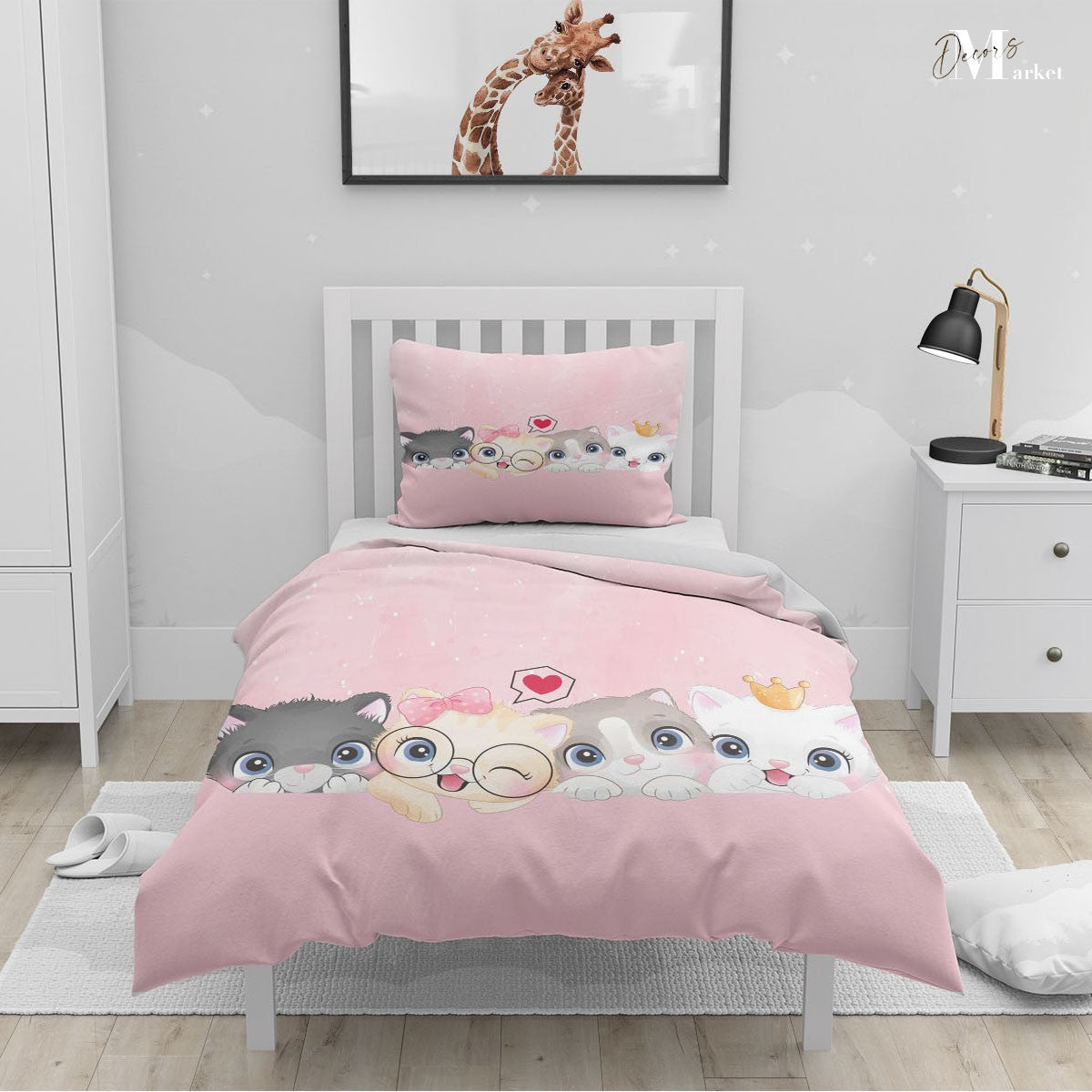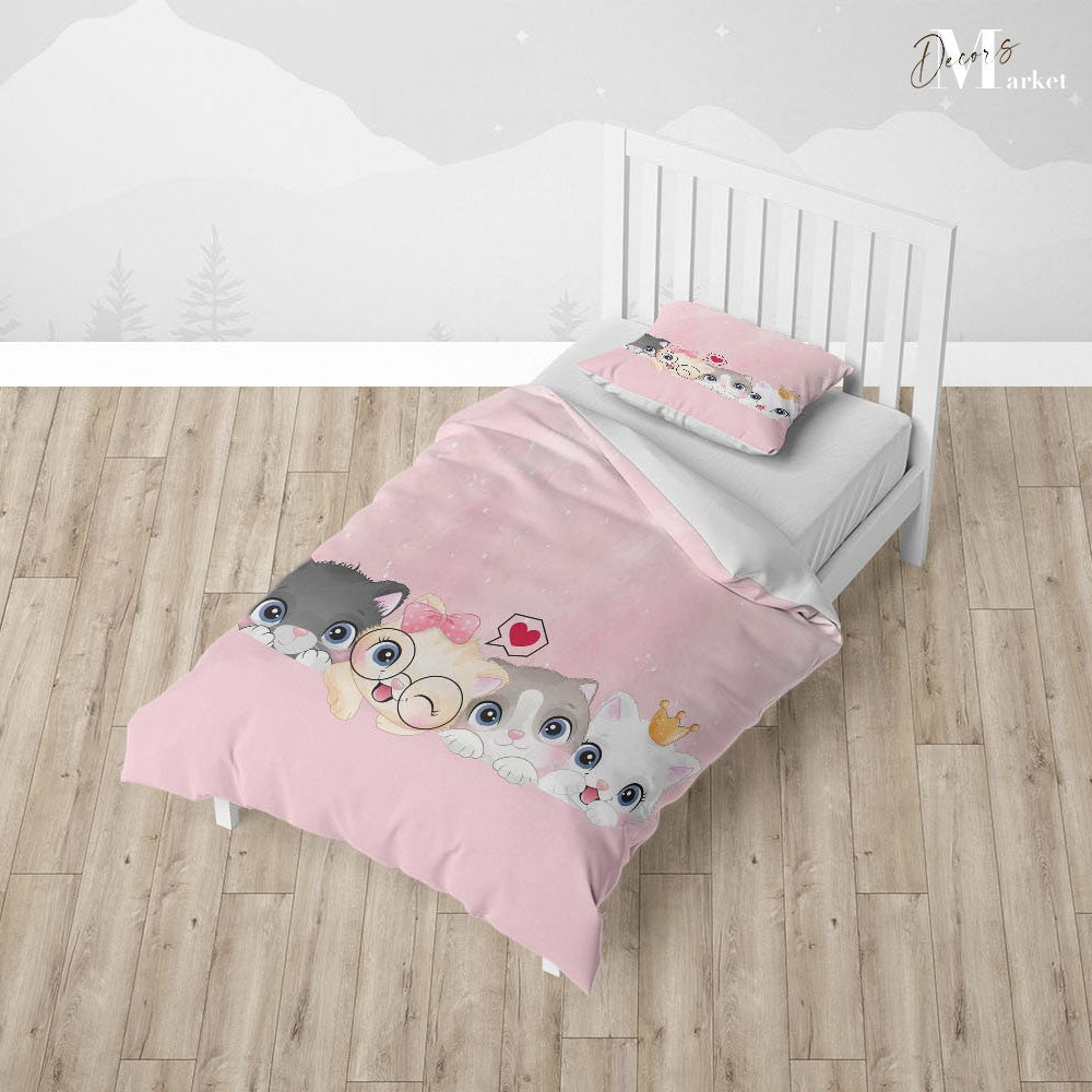 Cat Family Baby Duvet Cover Set w Pillow Cover, Pink Kids Cartoon 3D Quilt Cover, Single Double Queen King Size Doona Cover