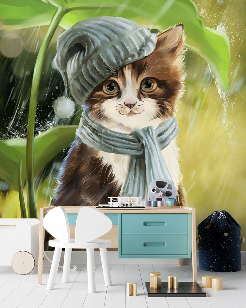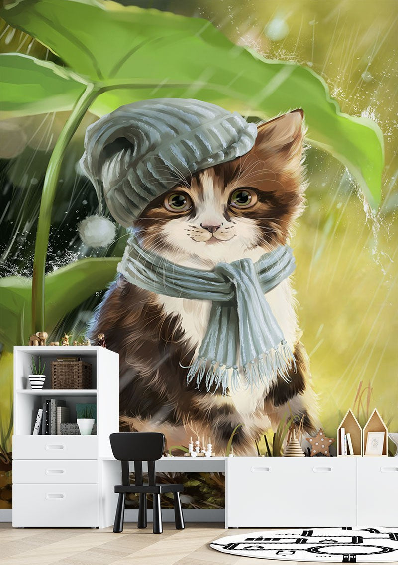 Cat In Rain Kids Animal Green Wallpaper Mural,Self-Adhesive Peel And Stick 3D Wall Paper,Australian Company Bedroom Wall Decor
