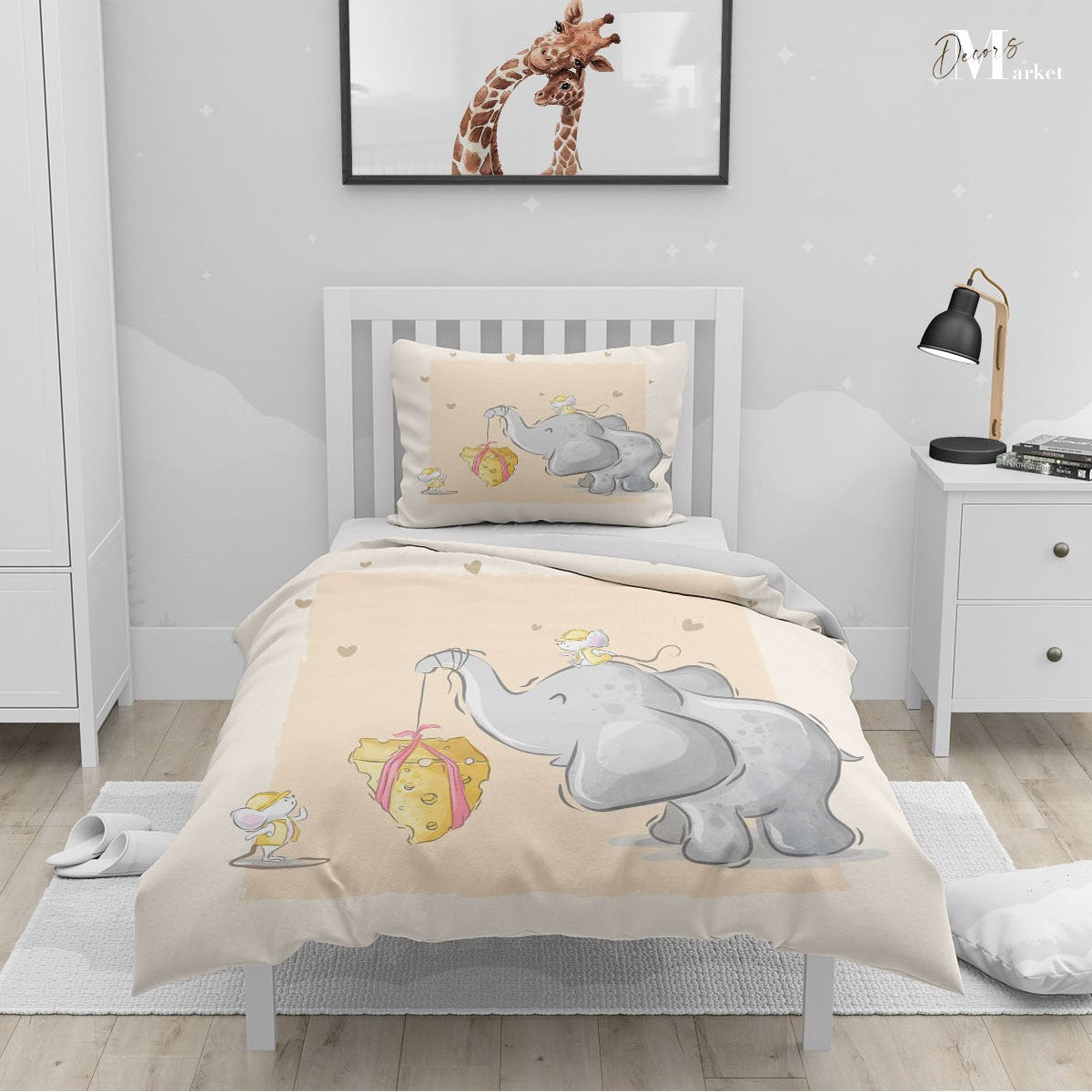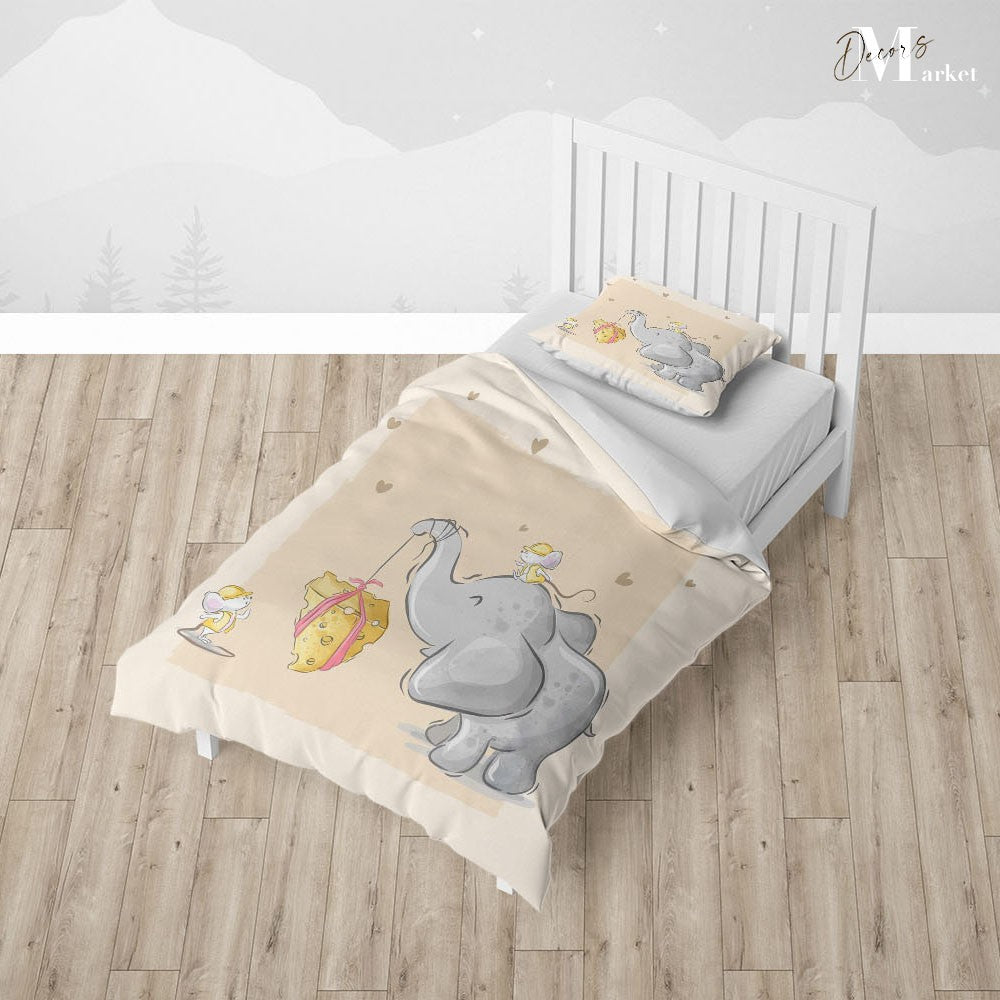Cheese Elephant Mouse Duvet Cover Set w Pillow Cover, Creamy Kids Cartoon 3D Quilt Cover, Single Double Queen King Size Doona Cover