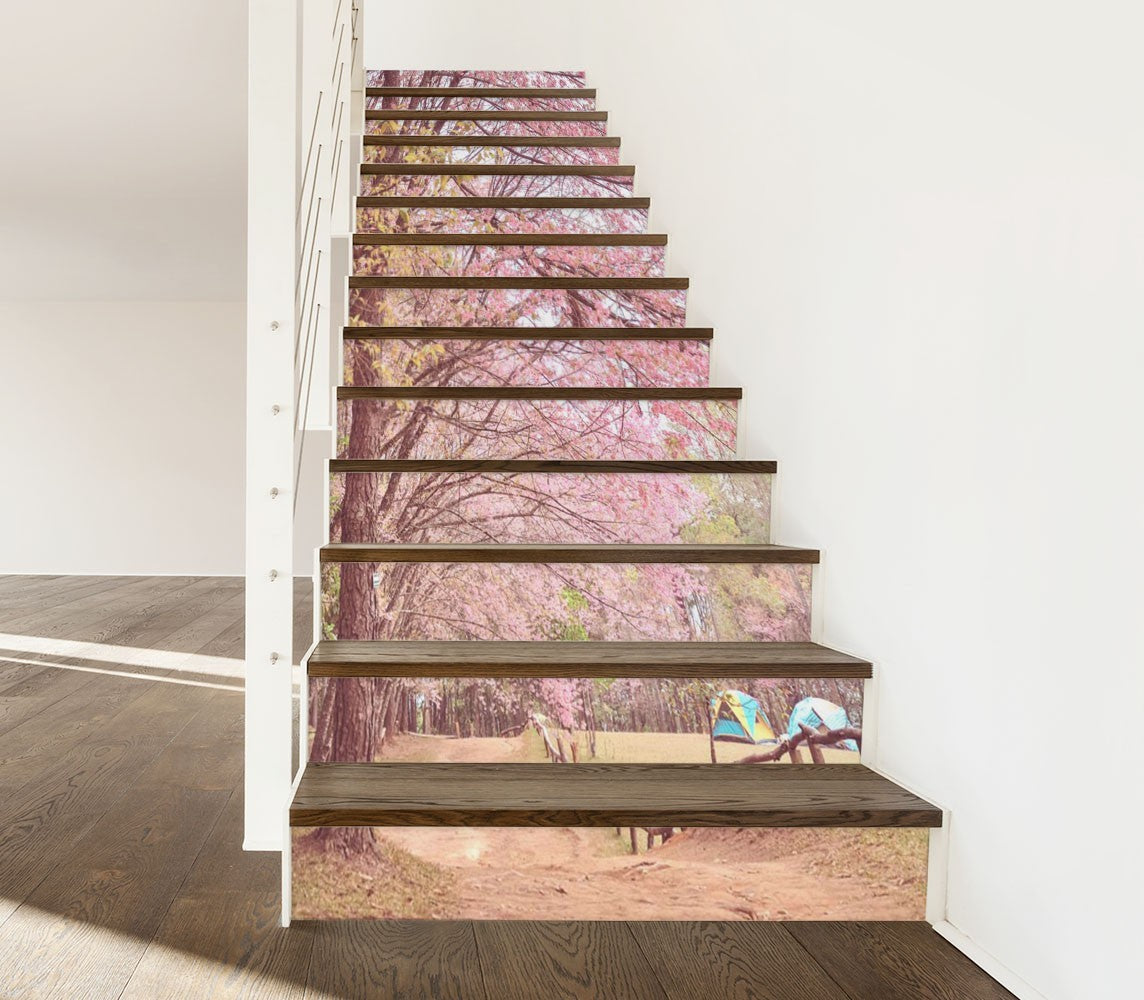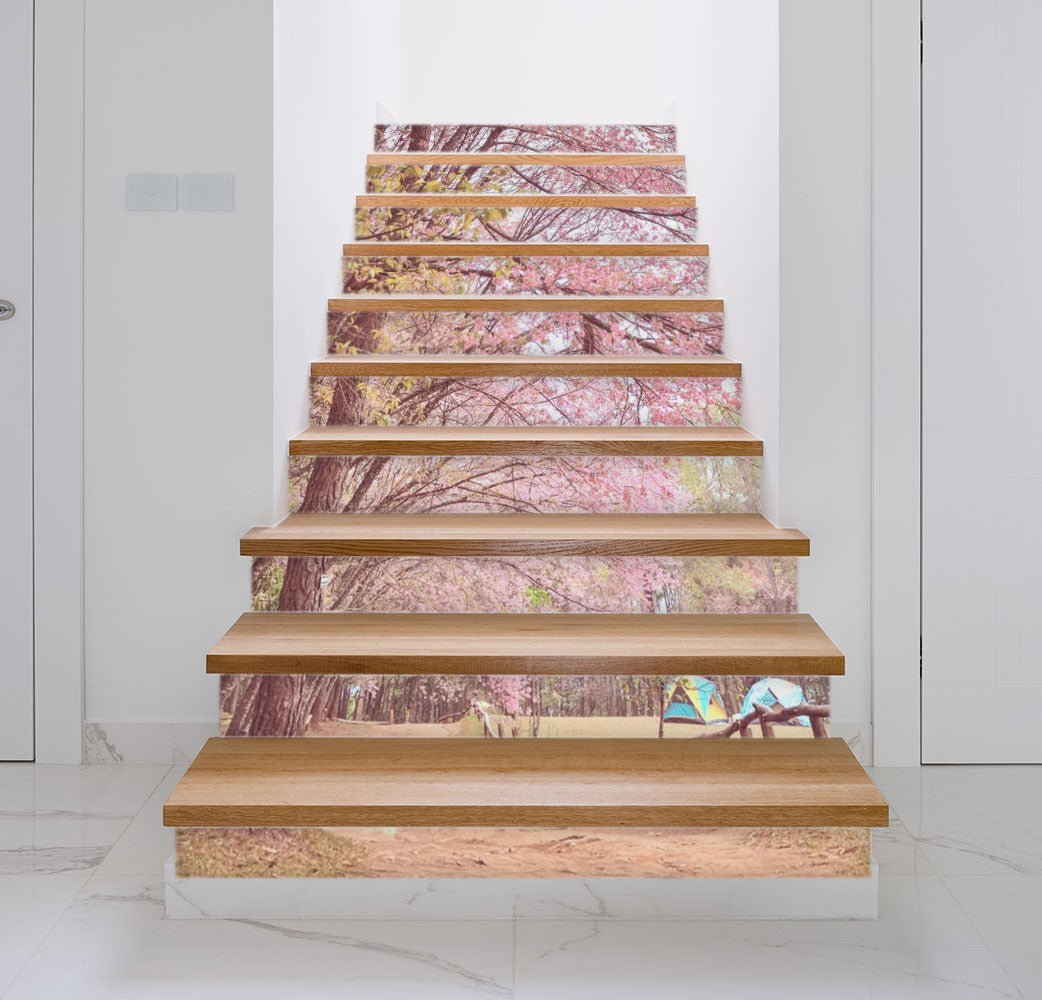 Cherry Blossom Floral Flowers Pink Stair Riser Decals, Waterproof Removable Staircase Decals, Vinyl Peel And Stick Stairs Decal Stickers