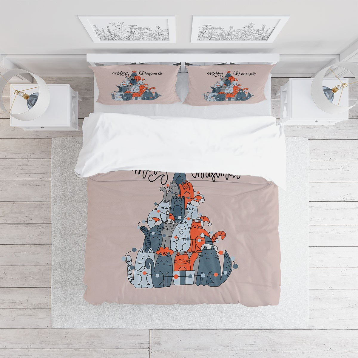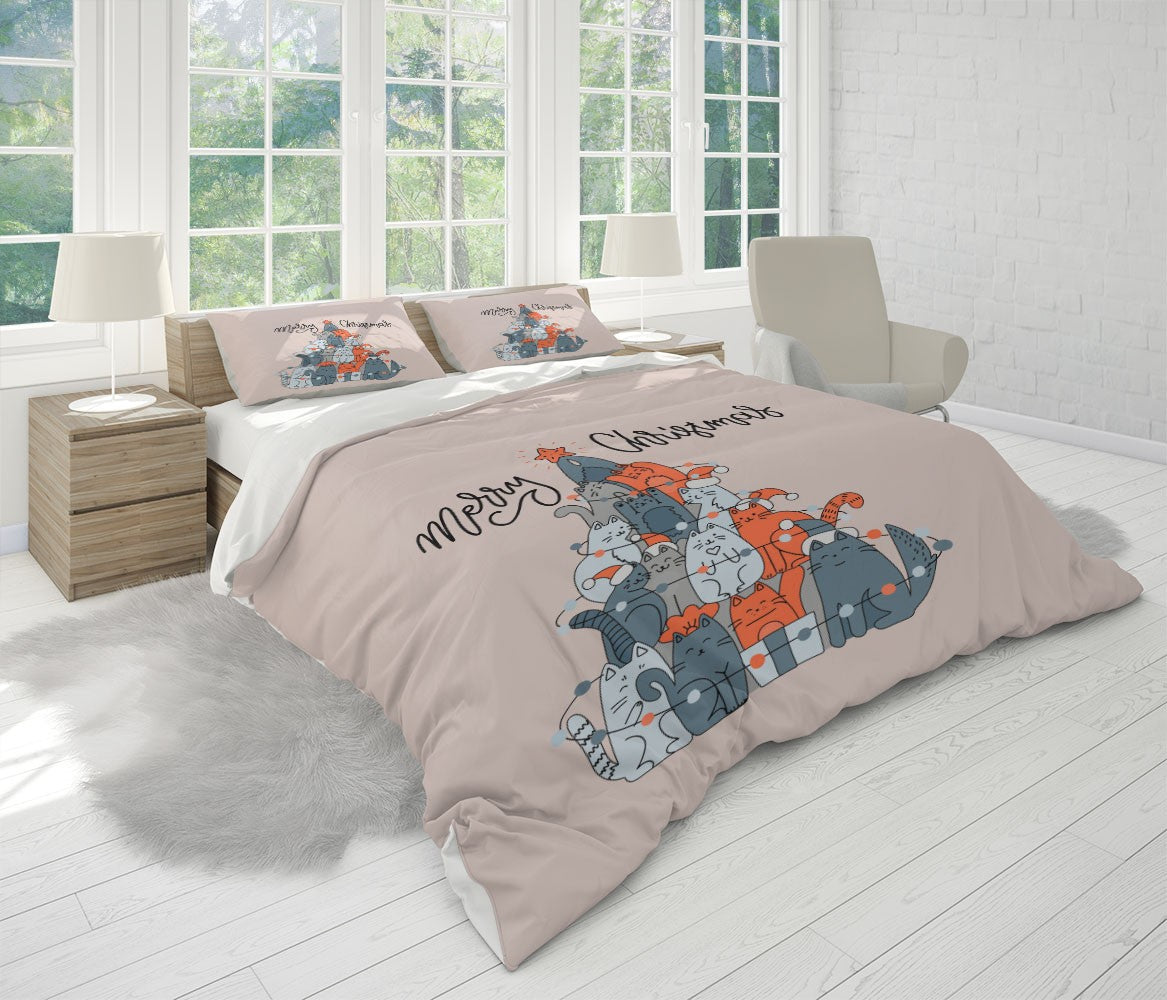 Christmas Cats Tree Duvet Cover Set W Pillowcases, Orange Animals Pets 3D Quilt Cover, 3Pc Single Double Queen King Size Doona Cover