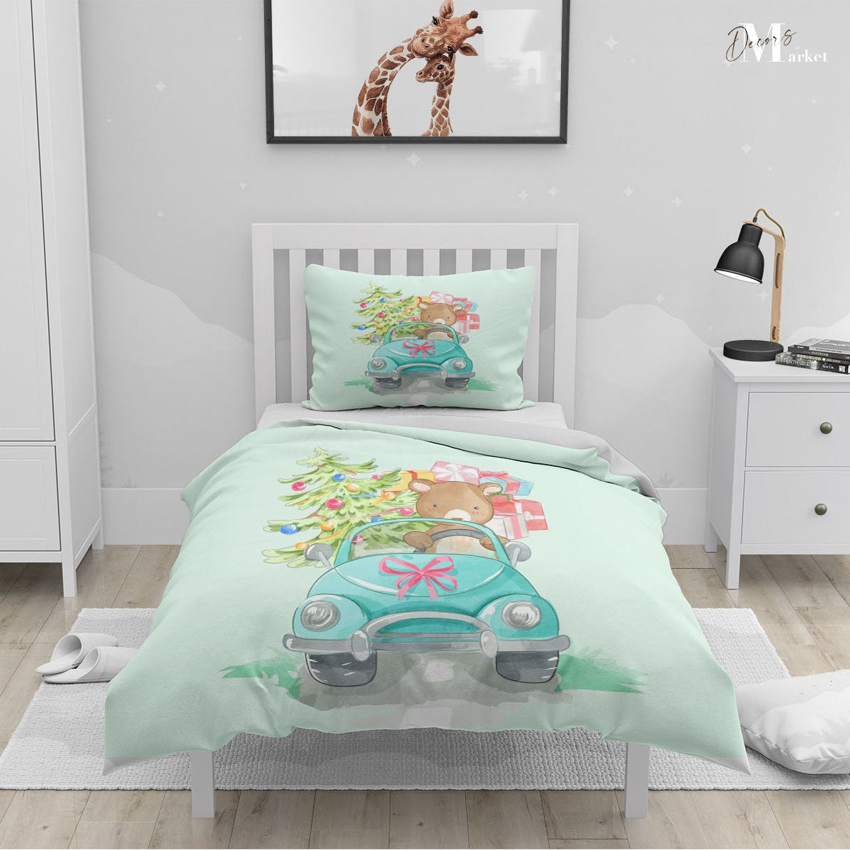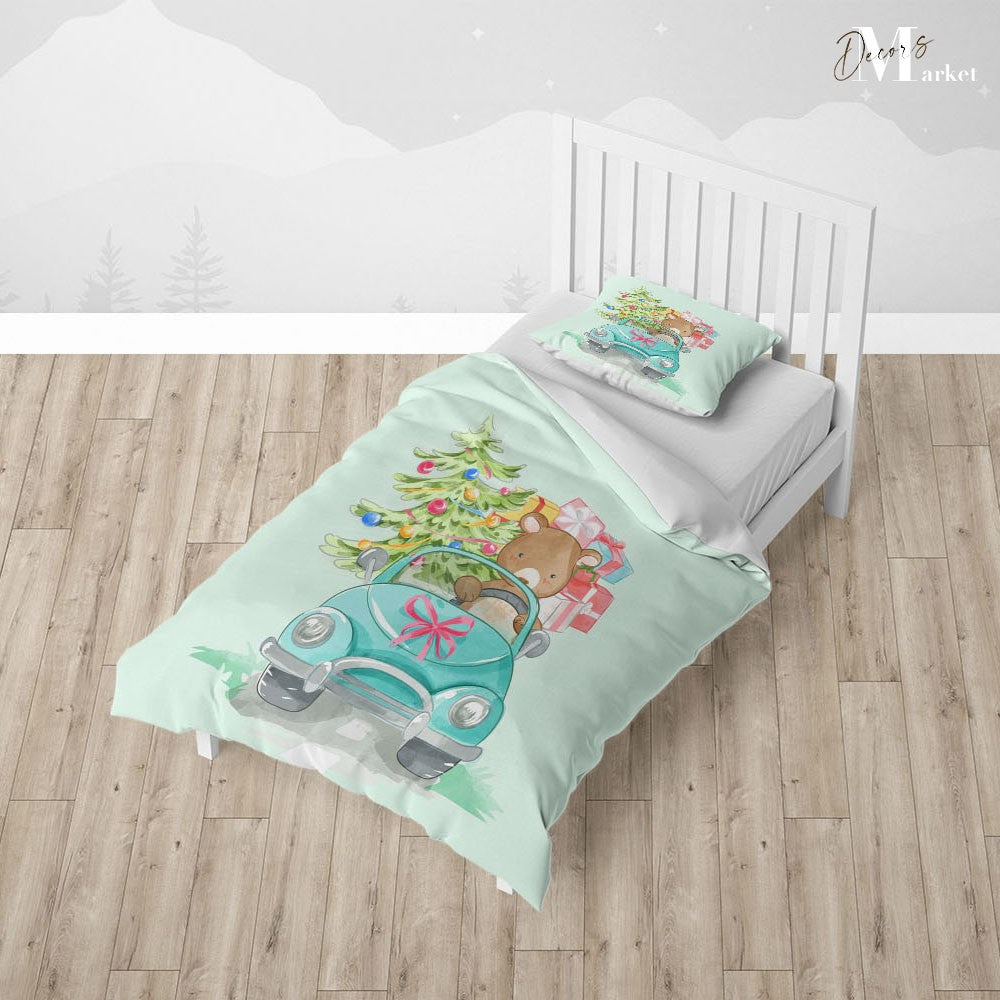 Christmas Gift Bear Duvet Cover Set w Pillow Cover, Green Kids Cartoon 3D Quilt Cover, Single Double Queen King Size Doona Cover