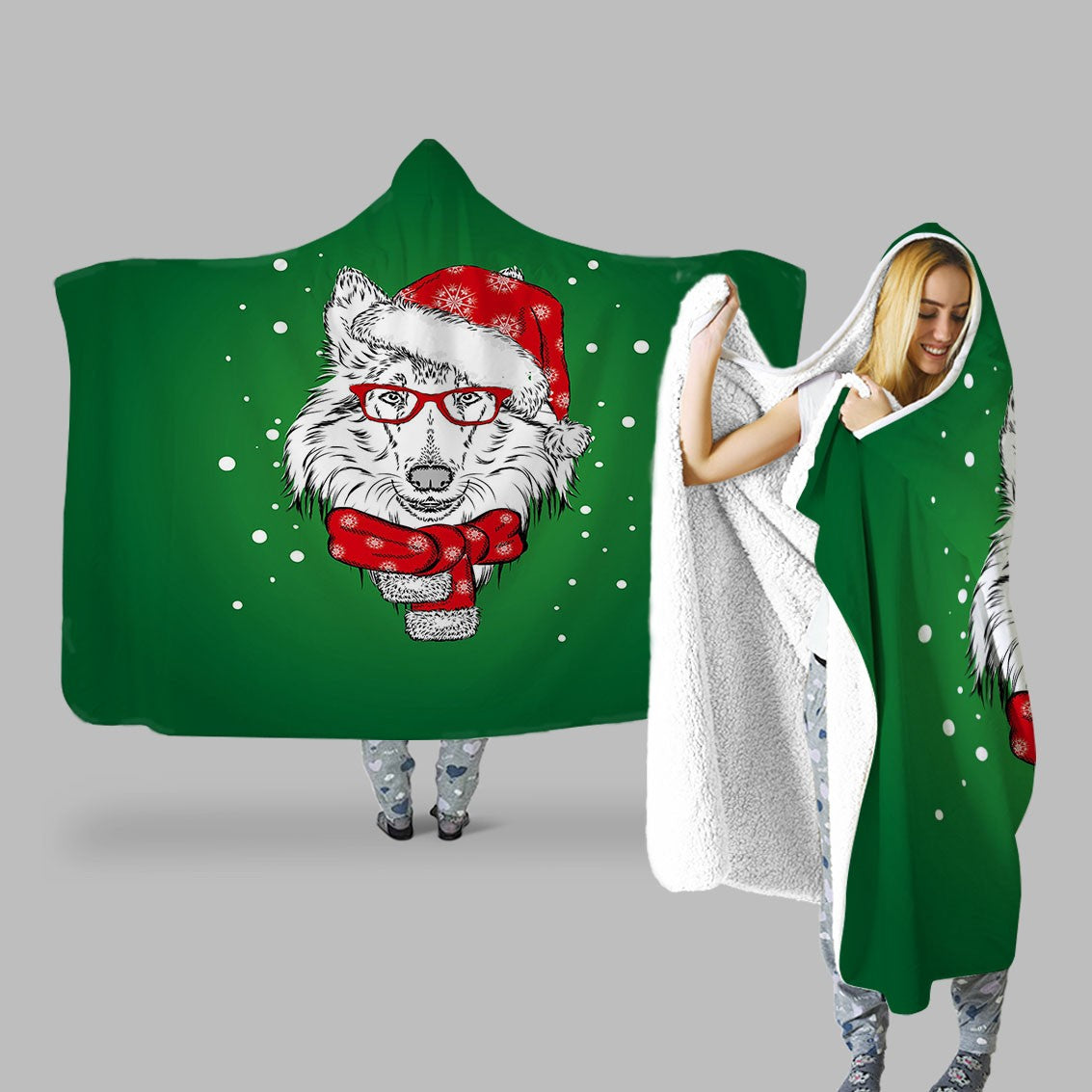 Custom Christmas Snow Wolf Hooded Throw Blanket - Green Fleece Hoodie Cape with Pop Art Design