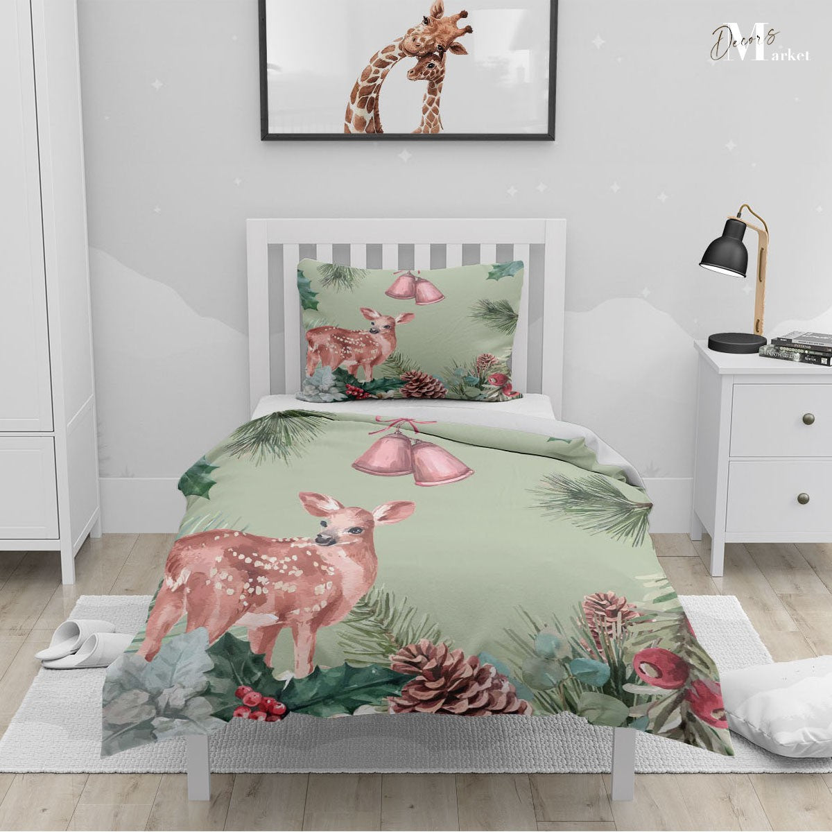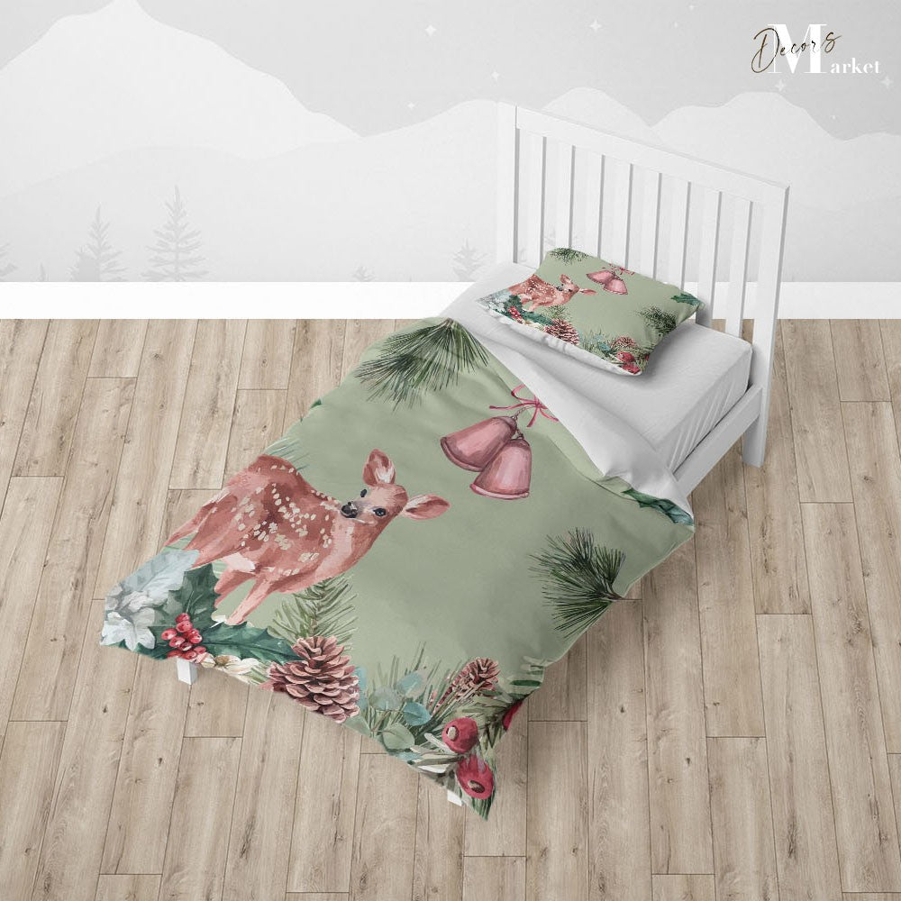 Christmas Tree Deer Duvet Cover Set w Pillow Cover, Green Floral Leaves 3D Quilt Cover, Single Double Queen King Size Doona Cover